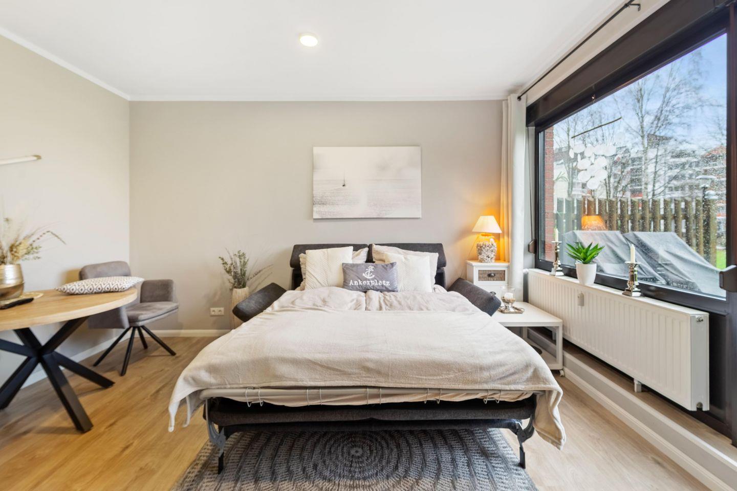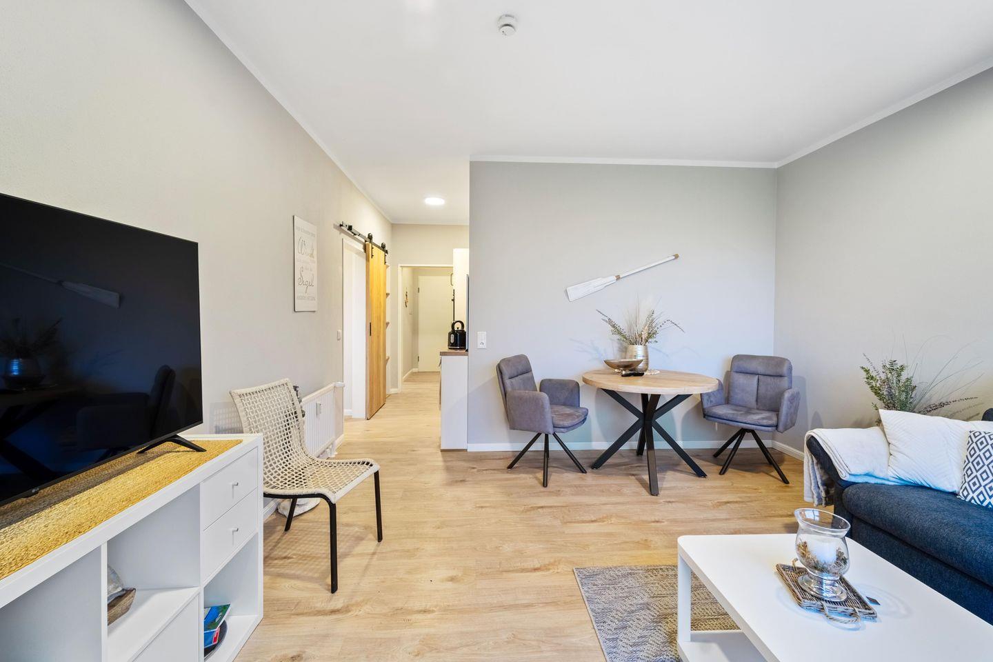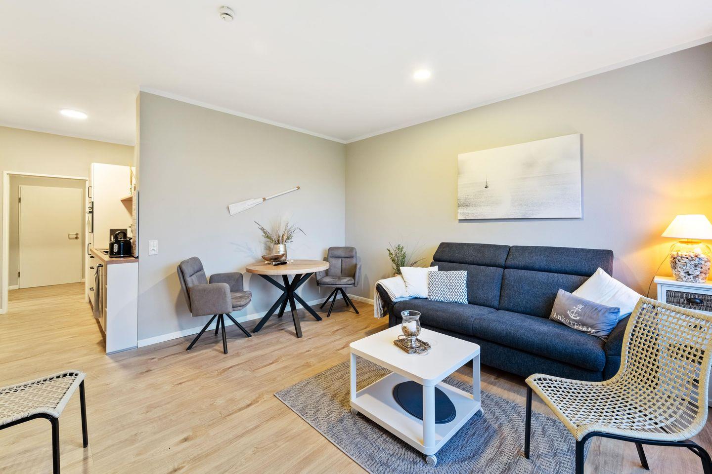 Die 40 qm große Wohnung mit einer 10 qm Terrasse ist modern und einladend gestaltet. Der Eingangsbereich führt Dich in das stilvolle Bad und das geteilte Wohn- und Esszimmer mit offener Küchenzeile. Die Küche ist voll ausgestattet - hier findest Du alles, was Du für einen sorgenfreien Aufenthalt benötigst. Das Wohnzimmer bietet einen Esstisch für vier Personen und ein bequemes Schlafsofa, bekannt für seinen hohen Schlafkomfort. Eine besondere Stalltür öffnet sich zum gemütlichen Schlafzimmer. Große Fenster im Wohnzimmer gewähren Dir einen traumhaften Blick auf den Yachthafen.