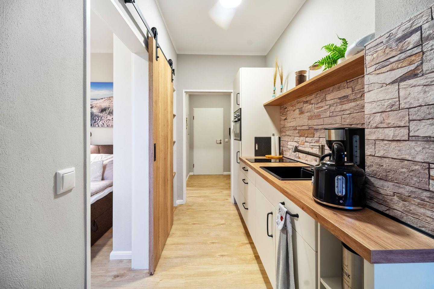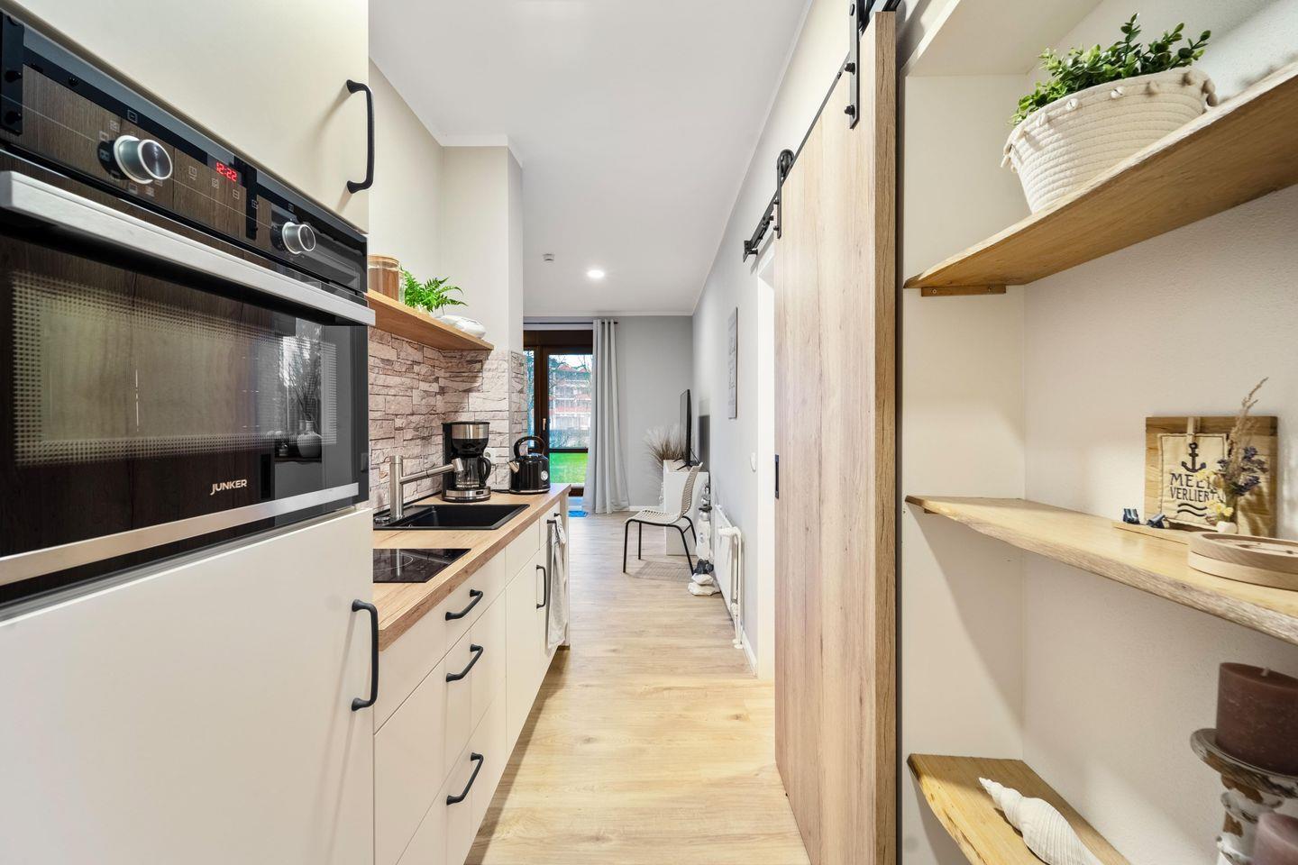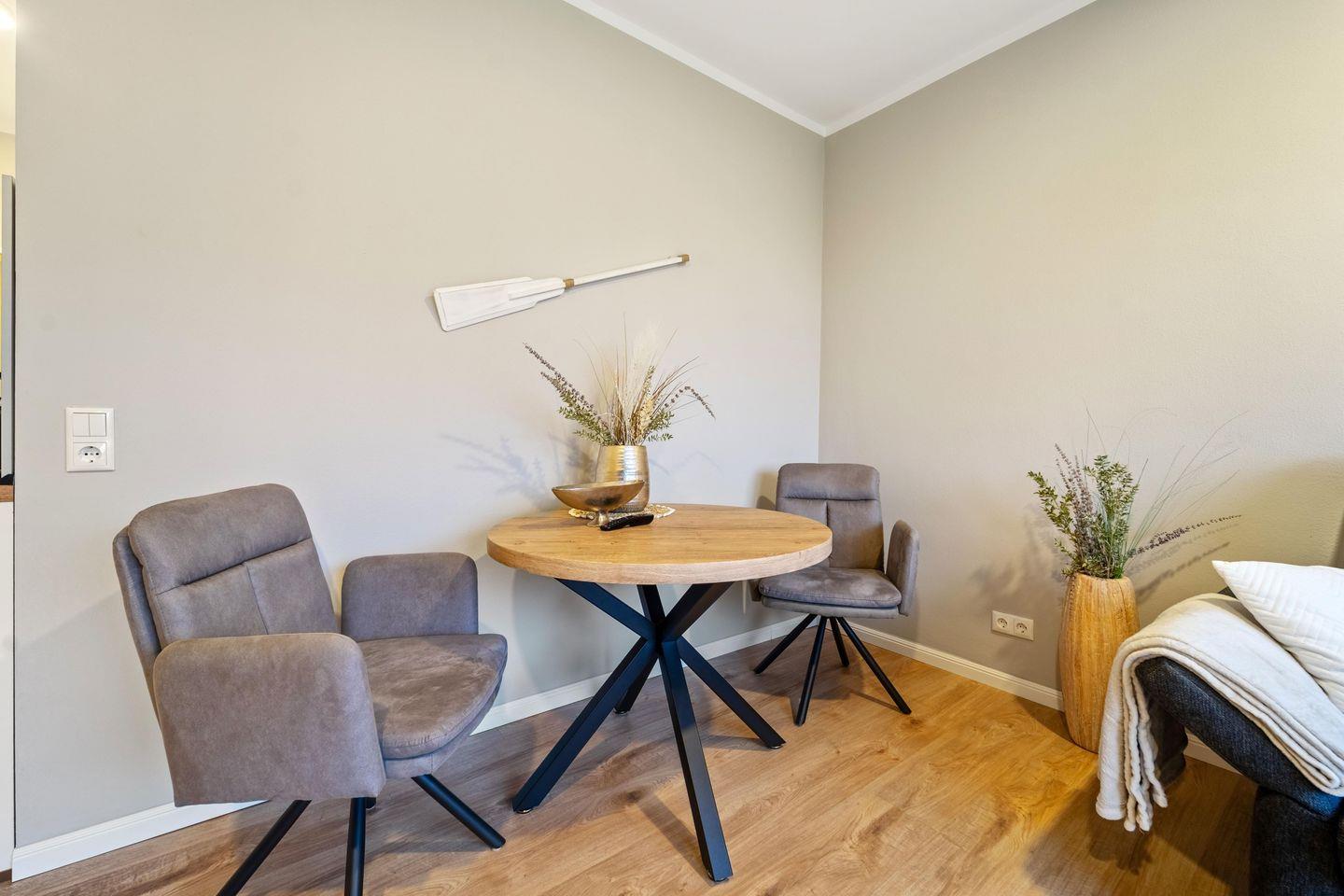 Die 40 qm große Wohnung mit einer 10 qm Terrasse ist modern und einladend gestaltet. Der Eingangsbereich führt Dich in das stilvolle Bad und das geteilte Wohn- und Esszimmer mit offener Küchenzeile. Die Küche ist voll ausgestattet - hier findest Du alles, was Du für einen sorgenfreien Aufenthalt benötigst. Das Wohnzimmer bietet einen Esstisch für vier Personen und ein bequemes Schlafsofa, bekannt für seinen hohen Schlafkomfort. Eine besondere Stalltür öffnet sich zum gemütlichen Schlafzimmer. Große Fenster im Wohnzimmer gewähren Dir einen traumhaften Blick auf den Yachthafen.