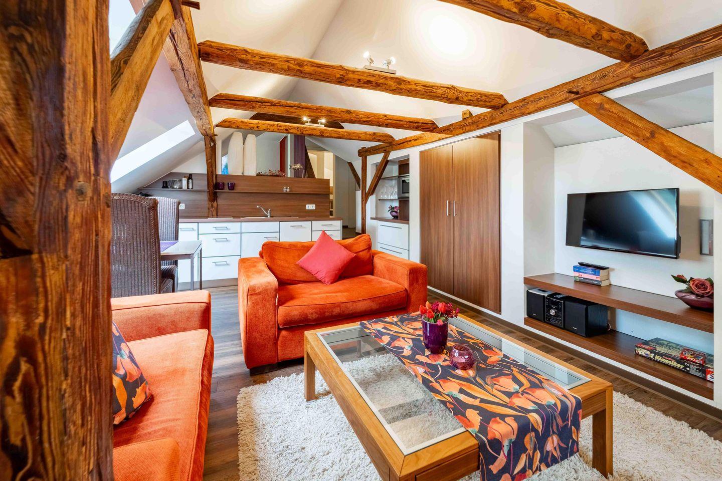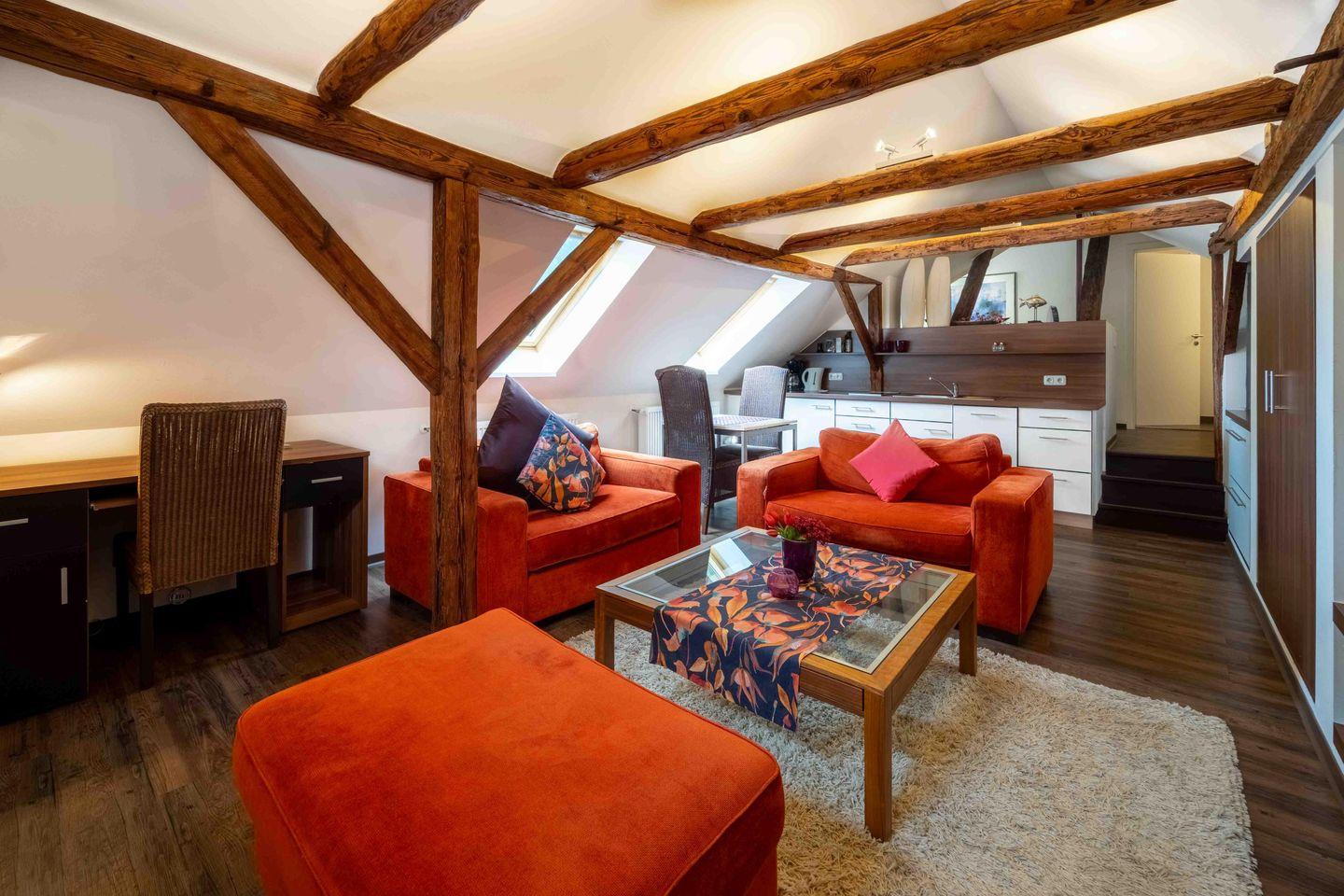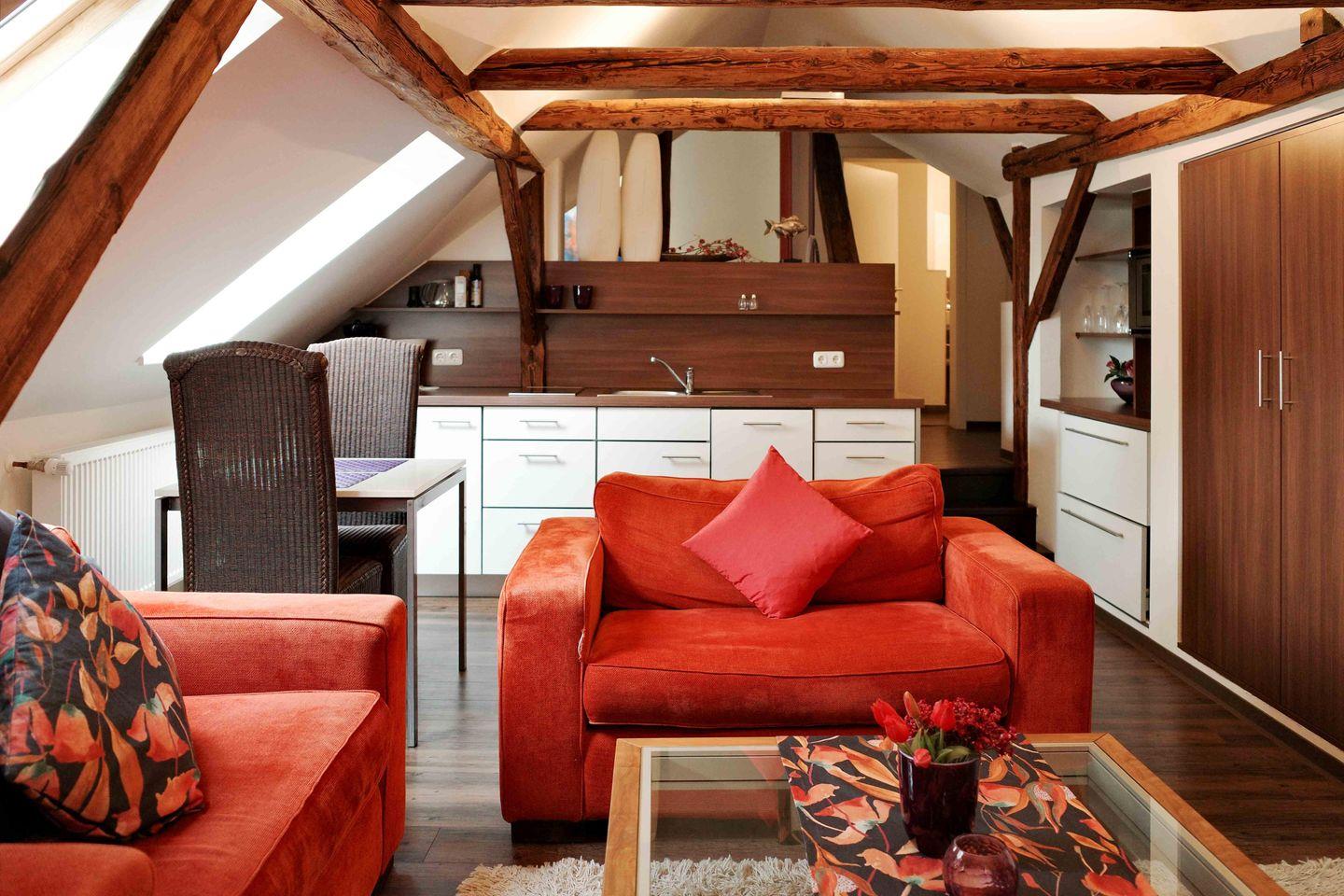 Diese gemütliche 1-Zimmer-Wohnung „Petit Superior“ bietet alles, was Du für einen unvergesslichen Aufenthalt benötigst. Der komplett offene Bereich erstreckt sich über zwei Ebenen, verbunden durch drei Stufen, und beeindruckt mit offenen Holzbalken, die der Wohnung einen besonderen Charme verleihen. Der großzügige Sitzbereich mit Sofa und Sessel lädt zum Entspannen ein, während die offene Küchenzeile alles bietet, was Du zum Kochen benötigst. Der Schlafbereich ist für zwei Personen ausgelegt und das moderne Badezimmer verfügt über eine bodengleiche Dusche.