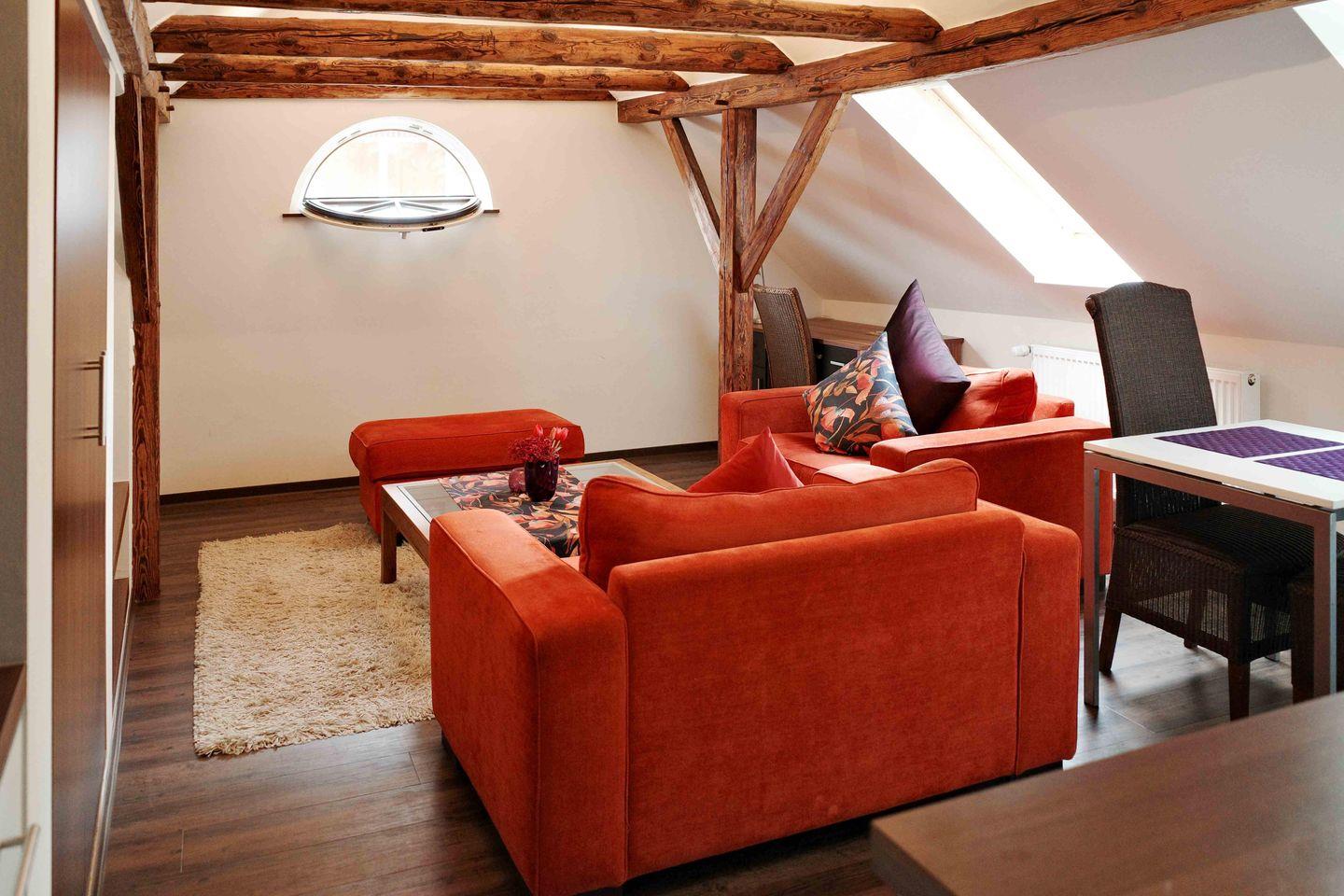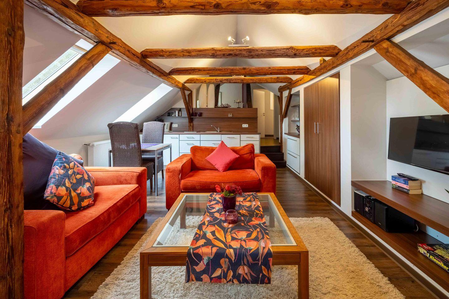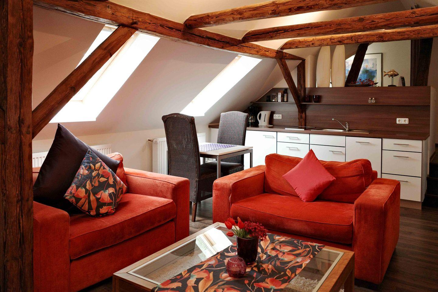 Diese gemütliche 1-Zimmer-Wohnung „Petit Superior“ bietet alles, was Du für einen unvergesslichen Aufenthalt benötigst. Der komplett offene Bereich erstreckt sich über zwei Ebenen, verbunden durch drei Stufen, und beeindruckt mit offenen Holzbalken, die der Wohnung einen besonderen Charme verleihen. Der großzügige Sitzbereich mit Sofa und Sessel lädt zum Entspannen ein, während die offene Küchenzeile alles bietet, was Du zum Kochen benötigst. Der Schlafbereich ist für zwei Personen ausgelegt und das moderne Badezimmer verfügt über eine bodengleiche Dusche.