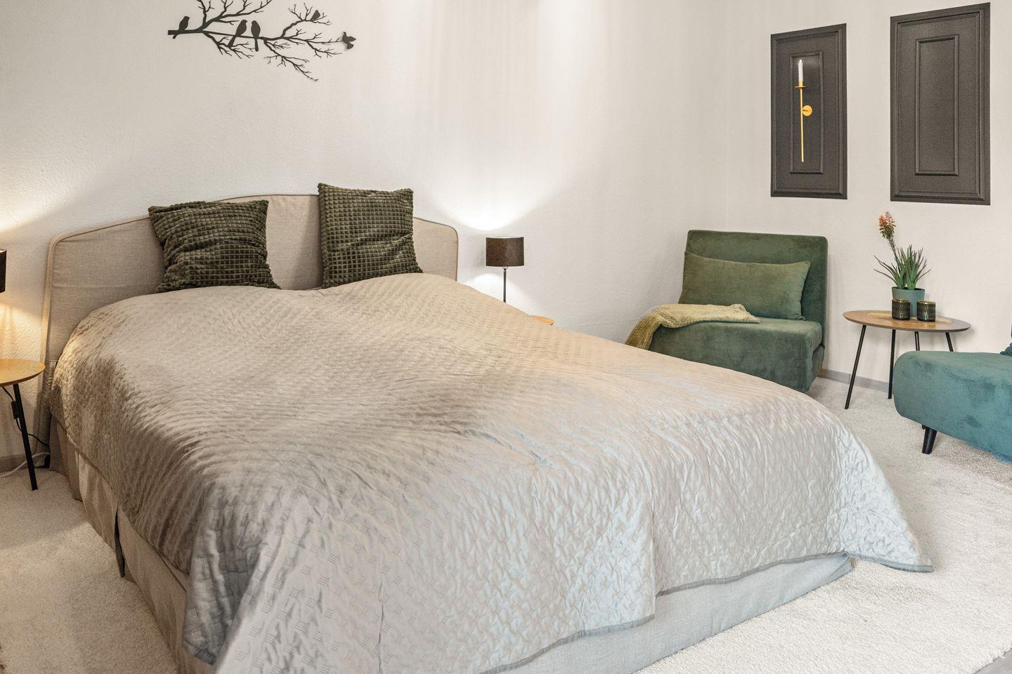 Das bequeme Bett sorgt für erholsame Nächte, während zwei große Sessel, die sich in zusätzliche Schlafmöglichkeiten verwandeln lassen, für Flexibilität sorgen. Die offene Küchenzeile ist modern und voll ausgestattet – perfekt, um sich auch im Urlaub selbst zu versorgen.