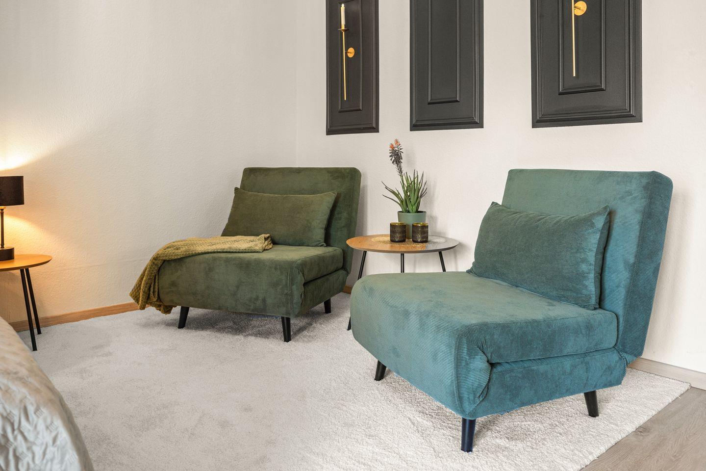 Beachtet bitte, dass bei 4 Personen die beiden Sessel im Wohnzimmer in Schlafgelegenheiten gewandelt werden. Sie können auch als Doppelbett gestellt werden. Maße eines Sessels: 77x200cm.