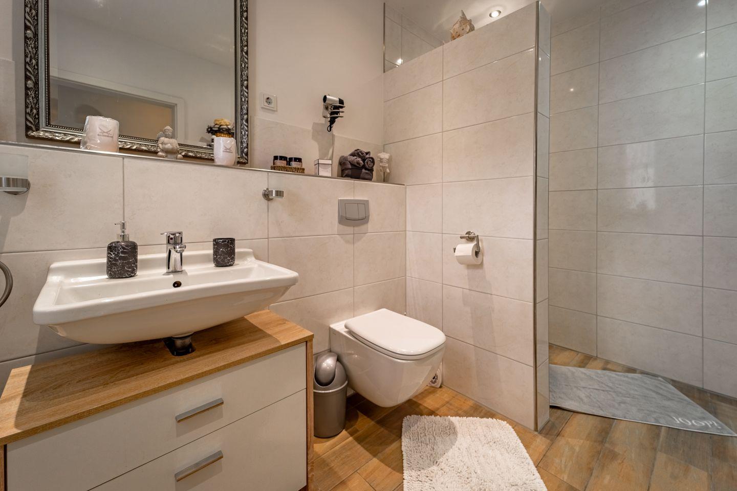 Das moderne Badezimmer ist ebenerdig begehbar und besonders für ältere Gäste angenehm zu nutzen. Große Fenster sorgen in der ganzen Wohnung für viel Licht und eine entspannte Wohnatmosphäre.