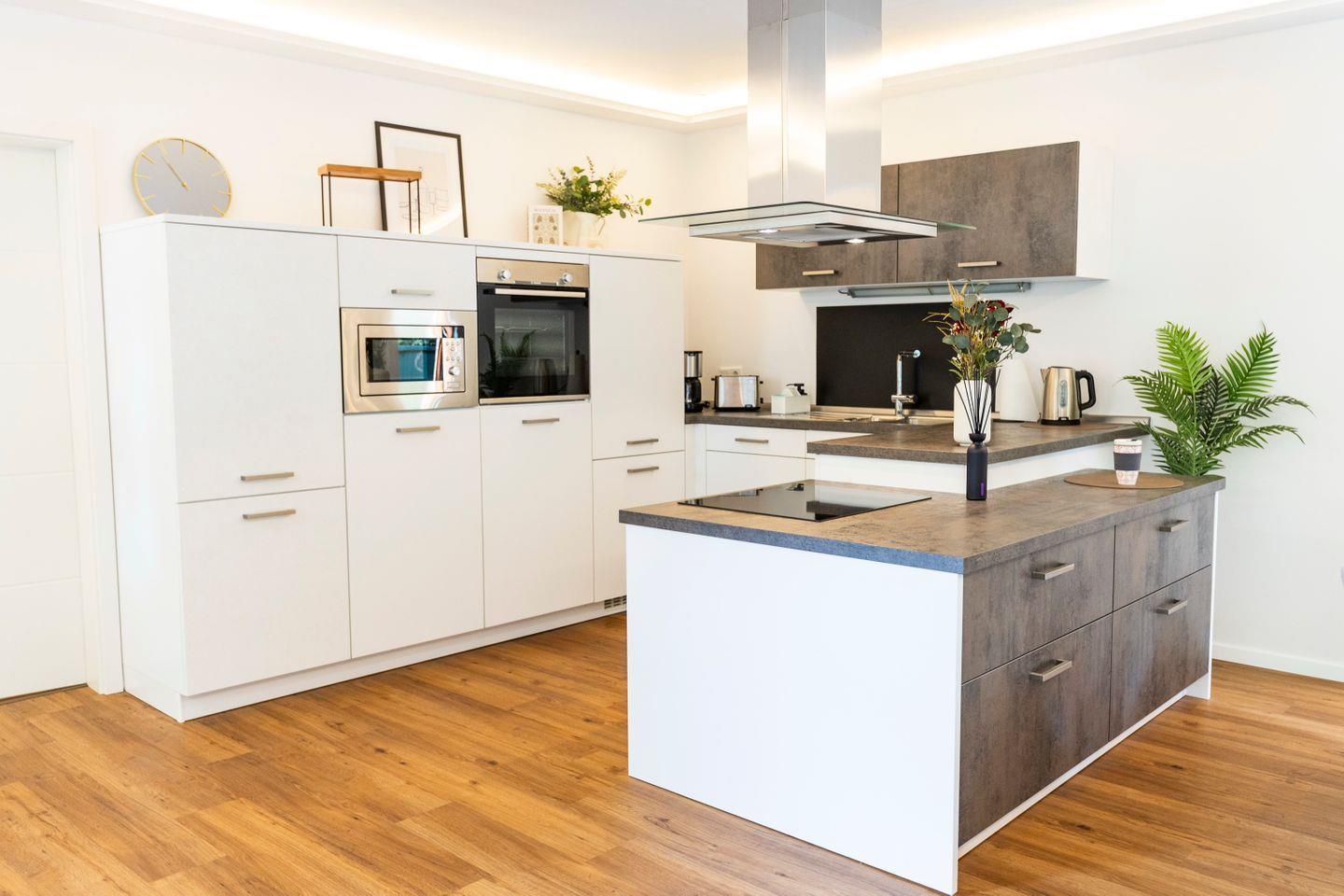Die voll ausgestattete Küche lädt zum Kochen ein – inklusive Kaffeemaschine, Spülmaschine, Waschmaschine & Waschtrockner sowie Basics wie Kaffee, Tee, Olivenöl & Zucker.