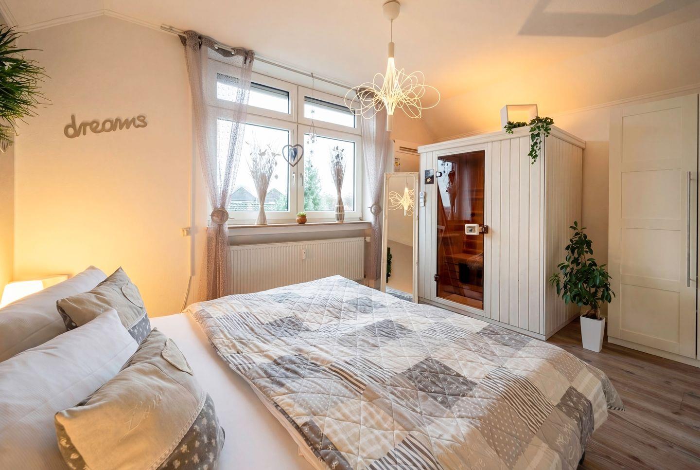 Der Wohnbereich ist offen gestaltet und wirkt durch das Giebeldach besonders luftig. Beim Kochen öffnet sich der Blick über die Dächer von Bad Zwischenahn, während der Balkon am Abend zu kleinen Auszeiten im Sonnenuntergang einlädt. Die eigene Infrarot-Sauna ist ein Highlight der Suite und macht den Aufenthalt angenehm persönlich und wohltuend.
