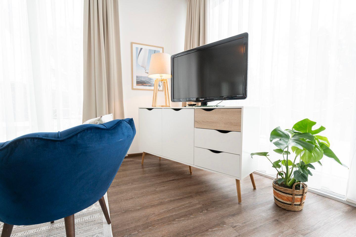 Beginne Deinen Tag mit leckerem Kaffee und genieße all die Annehmlichkeiten dieses Apartments, einschließlich der großen Terrasse mit exklusivem Seeblick, großzügigen Sitzbereichen für 4 Personen, einem Grill und Zugang zur Sauna auf der Anlage. Die Wohnung ist inspiriert vom Element Wasser, was sich in einem ruhigen und erfrischenden Interior-Design widerspiegelt.