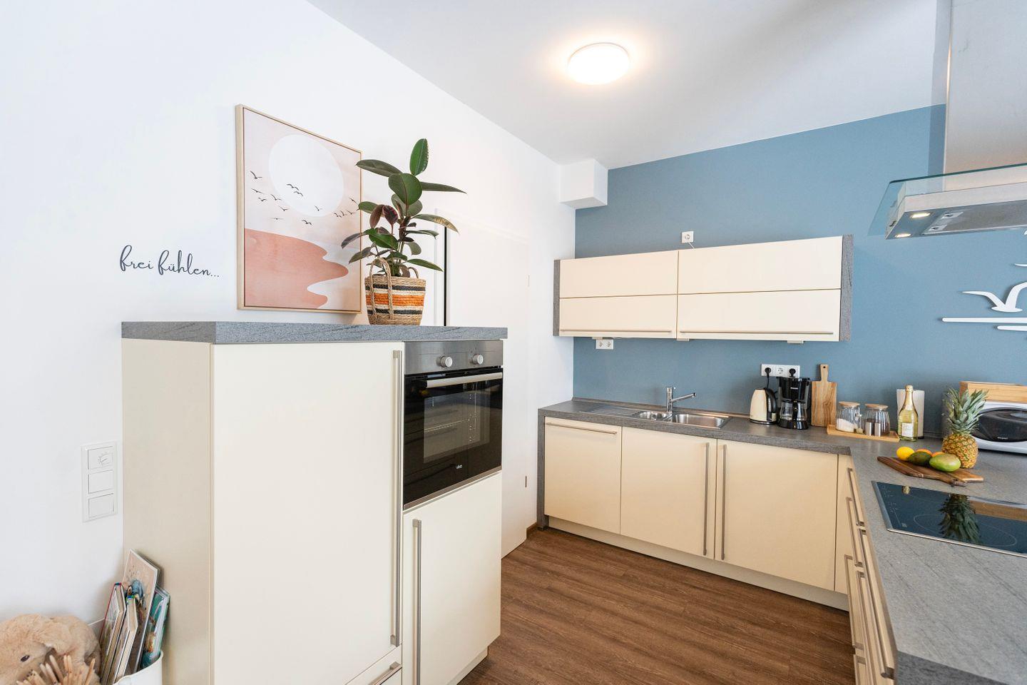Die Küche ist natürlich voll ausgestattet mit Herd, Kühlschrank, Backofen, Spülmaschine, Mikrowelle und allem was Du sonst brauchst um lecker zu kochen. Das Apartment verfügt ebenso über eine Waschmaschine.