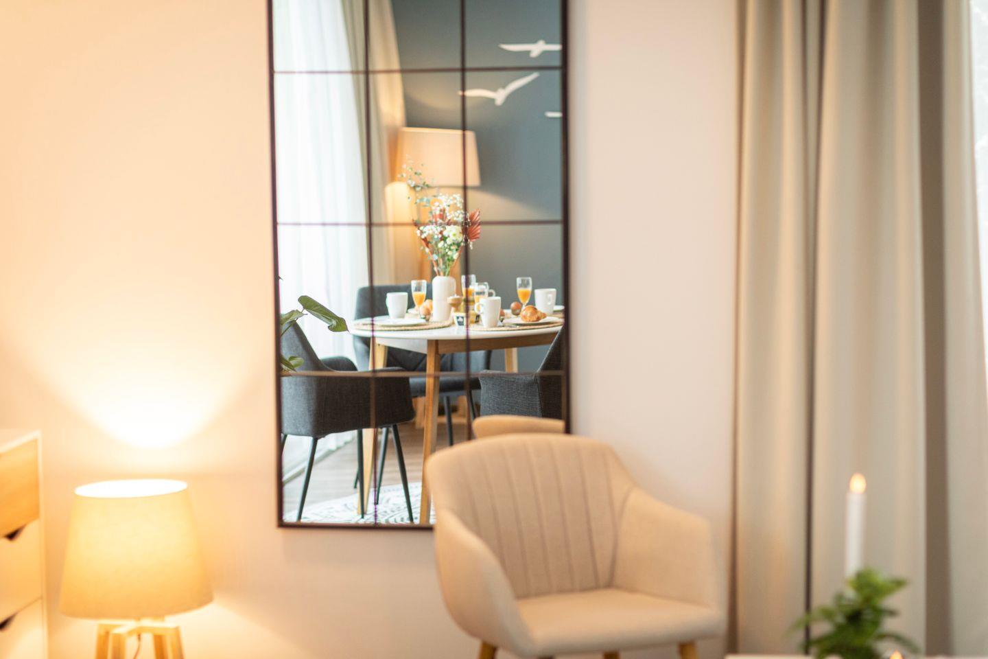 Mit dem Auto kannst Du unsere kostenfreien Stellplätze direkt am Haus nutzen. Dich erwartet ein 59 Quadratmeter großes Apartment mit 1 Schlafzimmern, 1 Bad, Wohnzimmer, Küche und Gäste WC.