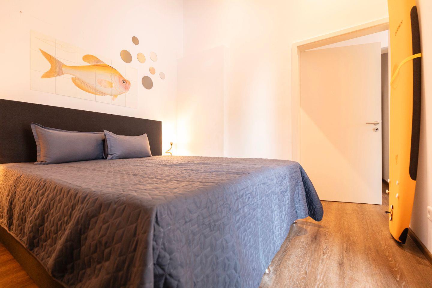 Beginne Deinen Tag mit leckerem Kaffee und genieße all die Annehmlichkeiten dieses Apartments, einschließlich der großen Terrasse mit exklusivem Seeblick, großzügigen Sitzbereichen für 4 Personen, einem Grill und Zugang zur Sauna auf der Anlage. Die Wohnung ist inspiriert vom Element Wasser, was sich in einem ruhigen und erfrischenden Interior-Design widerspiegelt.