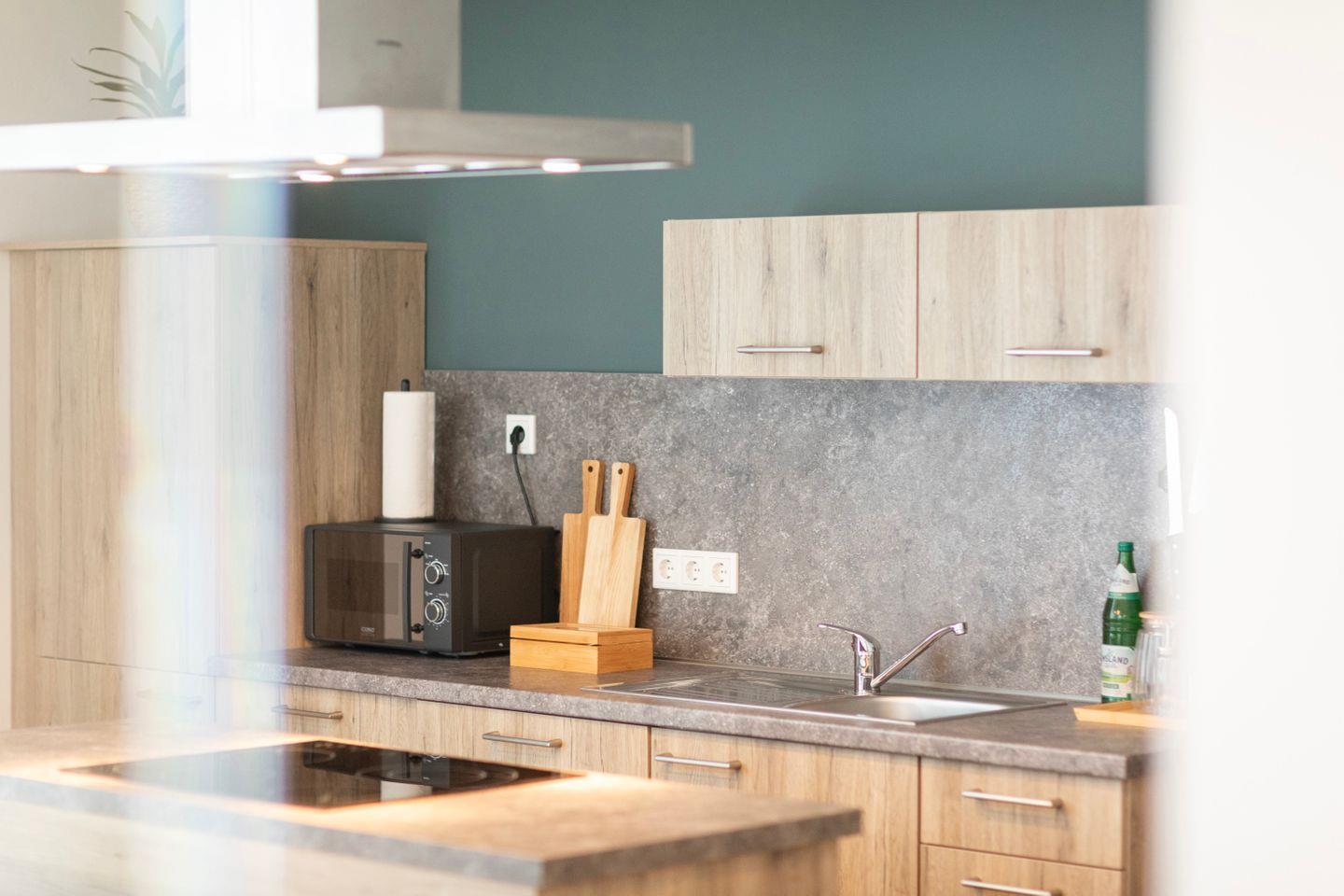 Die Küche ist voll ausgestattet mit Herd, Kühlschrank, Backofen, Spülmaschine, Mikrowelle und allem, was Du zum Kochen brauchst. Zusätzlich steht eine Waschmaschine zur Verfügung.