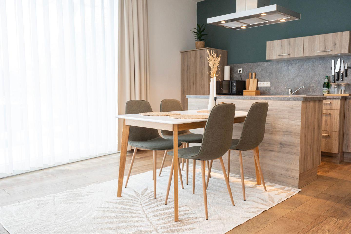 Das Schlafzimmer bietet ein gemütliches 1,80m Doppelbett. Im Wohnzimmer findest Du eine hochwertige Schlafcouch, ideal für Familienbesuche, sowie einen großen Essbereich für 4 Personen und einen bequemen Sitzbereich mit Sofa und TV. Zusätzlich gibt es einen Arbeitsplatz mit Schreibtisch und schnellem Internet, perfekt für produktive Stunden oder als Homeoffice.