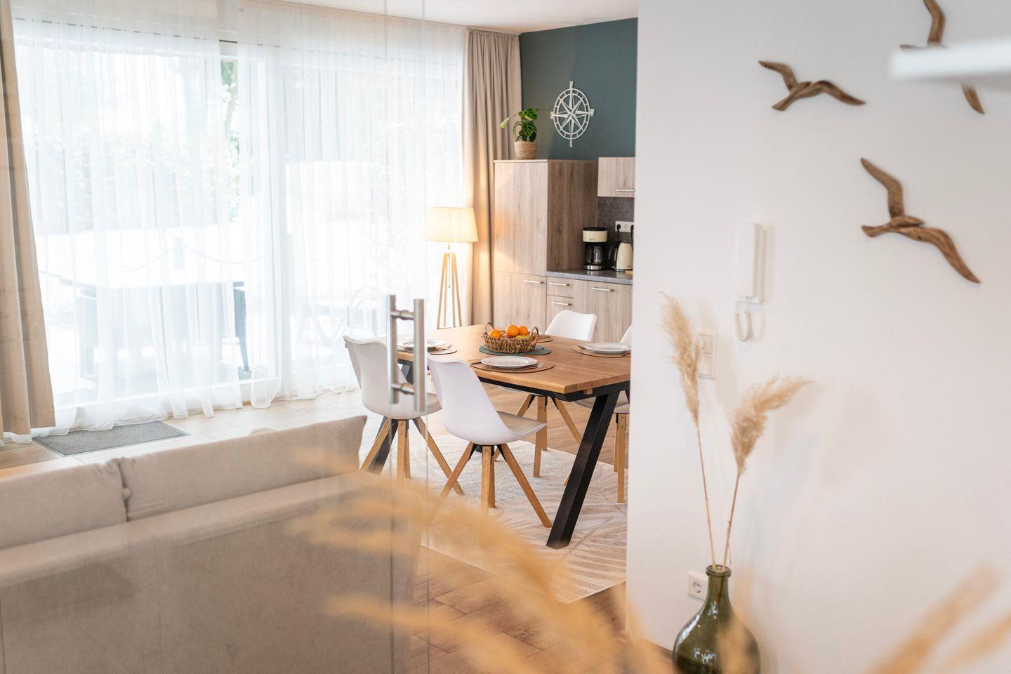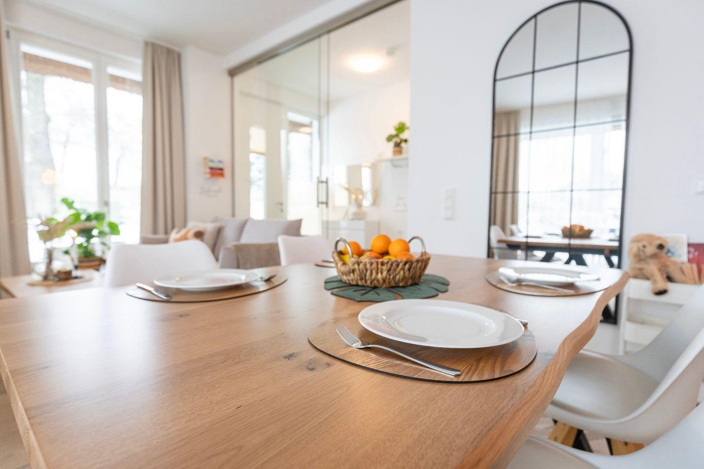 Das Schlafzimmer verfügt über ein gemütliches 1,60m Doppelbett. Im Wohnzimmer findest Du nicht nur hochwertige Schlafcouch, die sich perfekt für Familienbesuche eignet, sondern ebenso einen großen Essbereich für 4 Personen sowie einen gemütlichen Sitzbereich mit Sofa und einem TV. Hier ist sowohl Raum für einen gemütlichen Fernsehabend, wie auch die Möglichkeit eines Spieleabends mit deinen Liebsten.