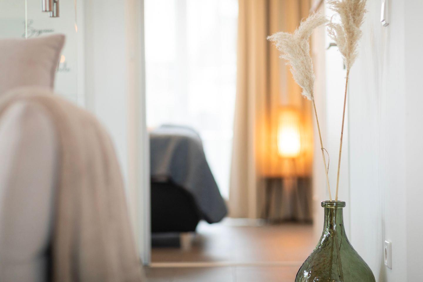 Mit dem Auto kannst Du unsere kostenfreien Stellplätze direkt am Haus nutzen. Dich erwartet ein 59 Quadratmeter großes Apartment mit 1 Schlafzimmern, 1 Bad, Wohnzimmer, Küche und Gäste WC.