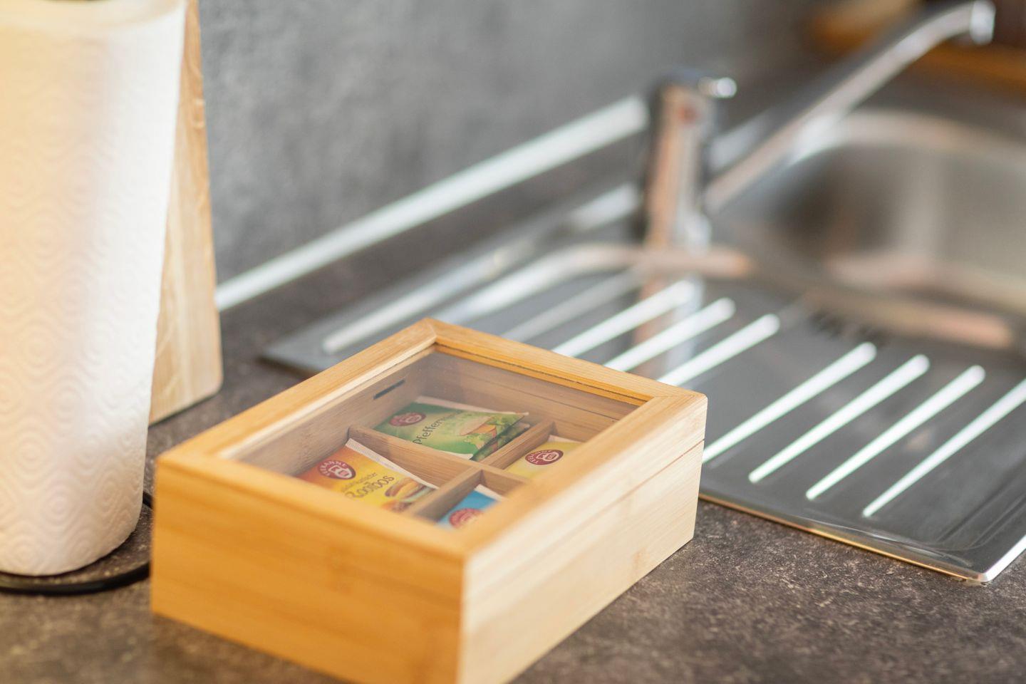 Du kannst deinen Tag mit leckerem Kaffee beginnen und all die schönen Annehmlichkeiten dieses Apartments genießen, inklusive der großen Terrasse mit exklusivem Seeblick, großzügigem Sitzbereichen für 4 Personen, einem Grill und einer Sauna auf der Anlage sowie einer tollen Aussicht in die Natur.