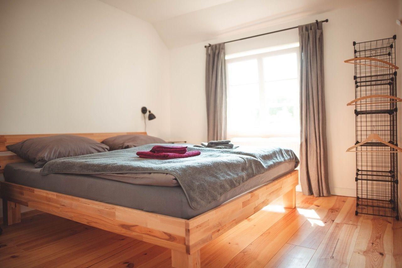 Das Haus verfügt über eine große offene Diele, die in direkt in den offenen Wohnbereich geht. Ebenso integriert ist die Küche. Es gibt zwei Schlafzimmer im Erdgeschoss - ein Schlafzimmer mit Doppelbett (180/200) und ein kleines Schlafzimmer mit einem Bett (140/200). Über eine steile Treppe geht es hoch auf die Galerie - hier steht ein breites und bequemes Schlafsofa zur Verfügung.