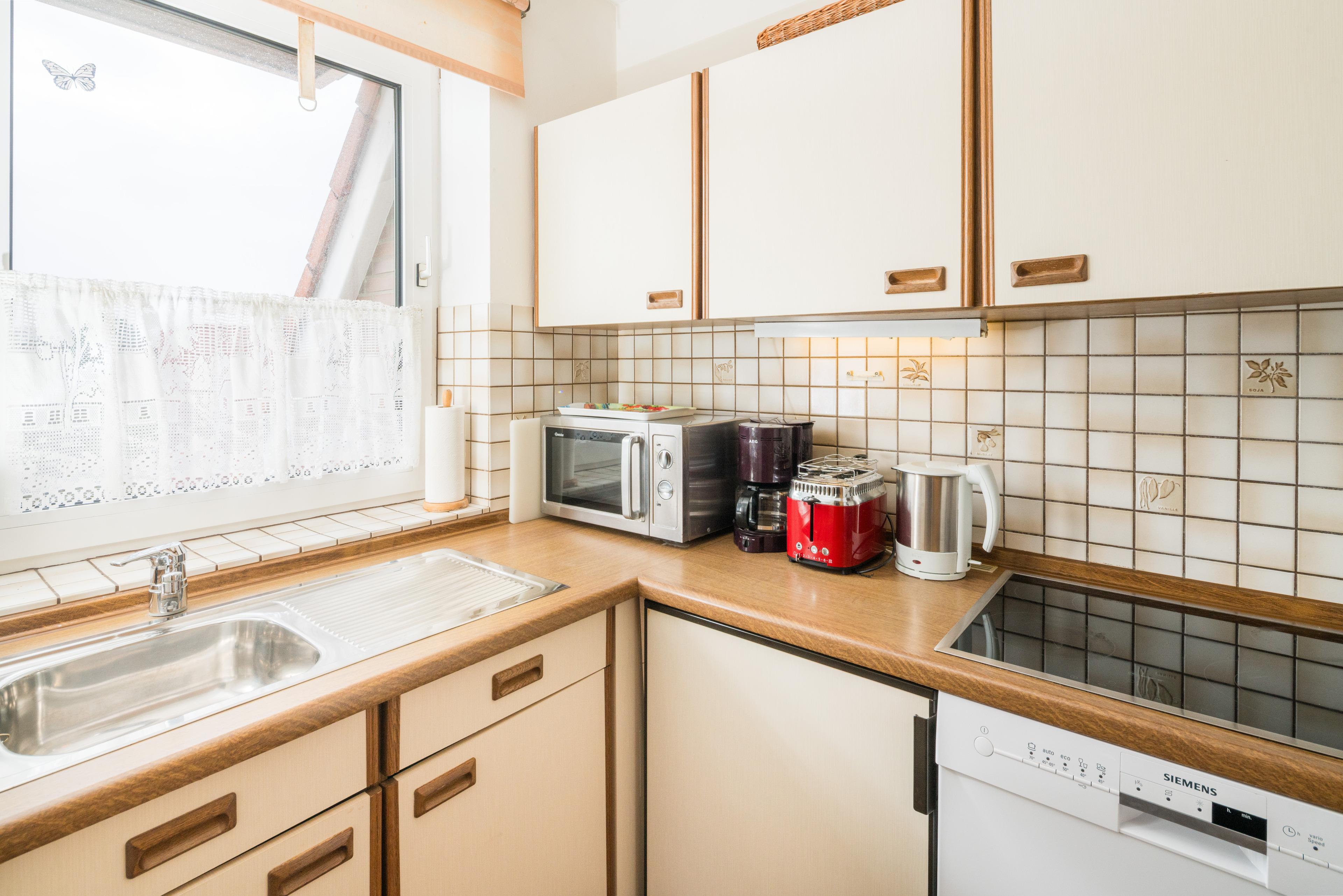 Gemütliche 50?qm-Ferienwohnung für bis zu 4 Personen mit Süd-Balkon, separatem Kinderzimmer und Wohn-Schlafraum. Voll ausgestattete Küche mit Spülmaschine, Sat-TV, WLAN, Dusche/WC. Entspannen Sie mit Büchern und Spielen aus unserer Ferienbibliothek!