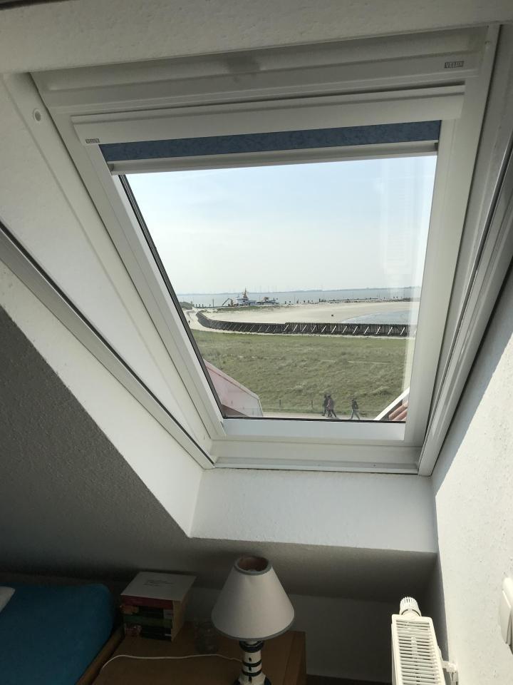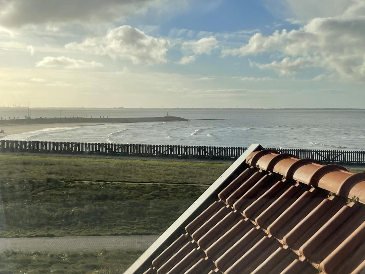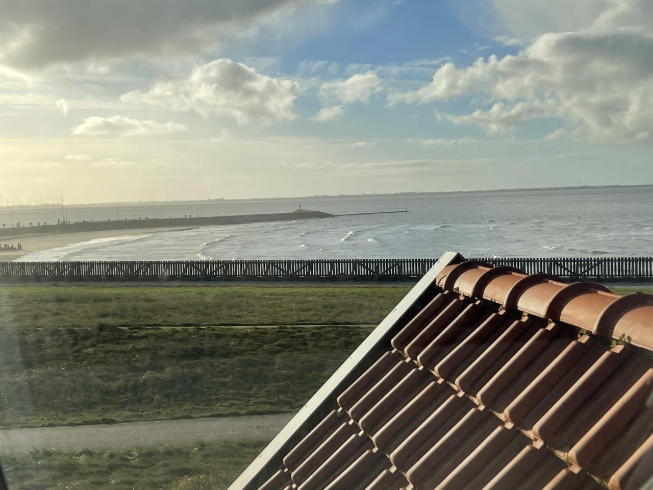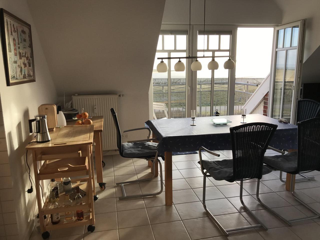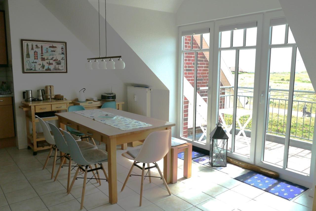 Großer offener Wohn-/ Essbereich und angeschlossener Süd-Balkon mit wunderbarem Meerblick auf das Watt, den Hafen, das Seegatt bis nach Norderney. Aus oberem Fenster direkter Nordseeblick