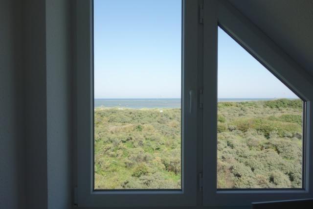 Zwei Schlafräume und das WC befinden sich im Erdgeschoss. Der Wohnraum ist mit einer weißen bulthaup-Küche ausgestattet. Der Blick vom Wohnzimmertisch aus geht über die Dünen auf das offene Meer. Im Obergeschoss hat man einen herrlichen Blick auf das Meer. Hier kann man auf einem Futon schlafen.