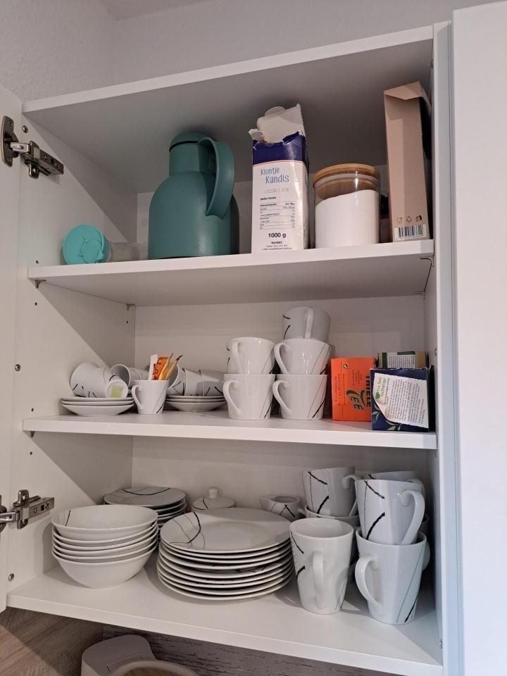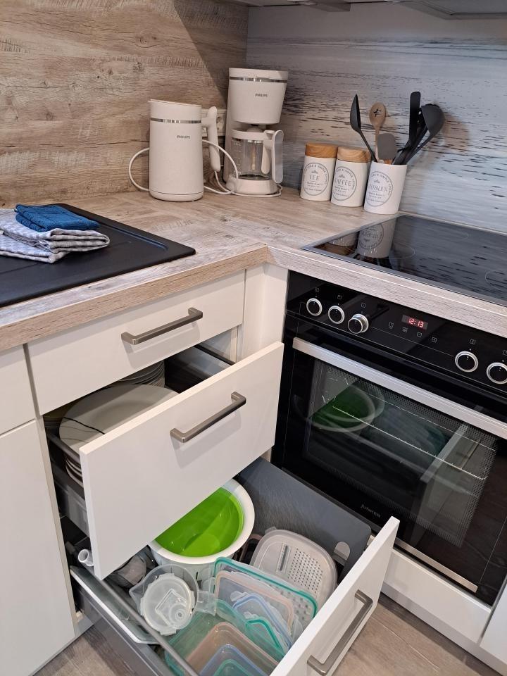 - Einbauküche mit Spülmaschine, Ceranfeld, Backofen, Kühlschrank, Eisfach, Mikrowelle & allen nötigen Küchenutensilien und -geräten.