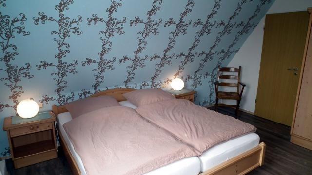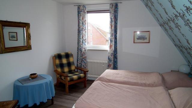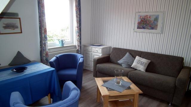 Wohnung auf der 1. Etage für 1-4 Personen mit Wohn/Schlafraum, Schlafraum, Du/WC Bad mit Haartrockner und Kosmetikspiegel. Im Wohnraum steht ein Schlafsofa zur Verfügung.