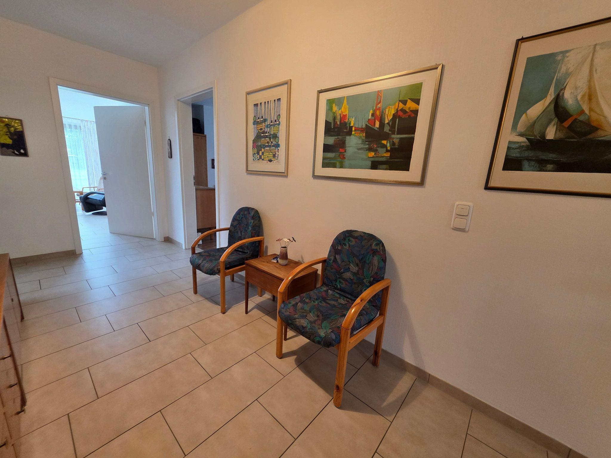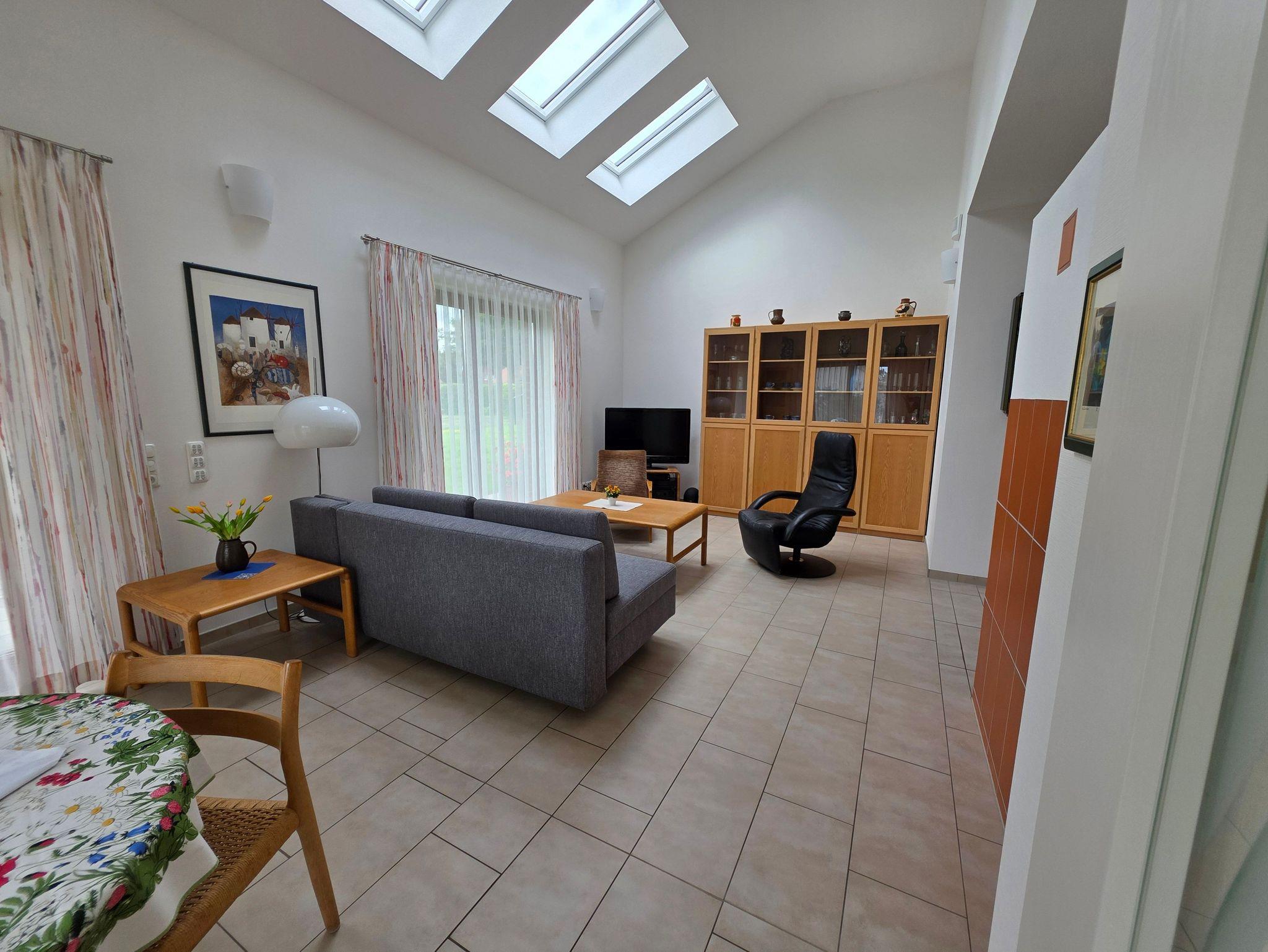 Unser barrierefreier Ferienbungalow (150 qm, Baujahr 2019) verfügt über 3 Zimmer und 2 Badezimmer sowie eine vollständig eingerichtete Küche. In Schlafzimmer 1 befindet sich ein Doppelbett (180x200 cm) und ein großzügiger Kleiderschrank. An dieses Zimmer schließt sich ein Badezimmer mit Badewanne (nach Absprache mit aufblasbarem Wannenlift), barrierefreier Dusche mit Duschhocker und unterfahrbarem Waschbecken an. Schlafzimmer 2 verfügt über ein voll funktionsfähiges Pflegebett mit den Maßen 140 x 200 cm (auch als Kinderbett geeignet), Schreibtisch und Regal. Gegenüber liegt ein weiteres Badezimmer mit ebenfalls barrierefreier Dusche. In der voll ausgestatteten Küche gibt es einen kleinen Esstisch, reichlich Geschirr und Töpfe sowie eine Grundausrüstung mit Ölen und Gewürzen. Im wunderbar lichtdurchfluteten Wohnzimmer finden sich eine Sitzecke mit Schlafcouch und eine Essecke mit ausziehbarem Tisch für bis zu acht Personen. Von hier aus können Sie auf die große Terrasse gelangen. Draußen lauschen Sie dem Plätschern des Wassers vom Bachlauf oder betrachten die Seerosen und Fische im Teich von der kleinen Brücke aus. Andere Sitzgelegenheiten im Garten laden zum Verweilen ein. Hier können Sie sich an den vielfältigen Blumen, Pflanzen und vorbeikommenden Schmetterlingen und Vögeln erfreuen. Nutzen Sie die große Rasenfläche für Spiele. Das Haus kann auf befestigten Wegen komplett umrundet werden. Es gibt einen überdachten Wäscheplatz und eine geschützte Abstellmöglichkeit für Fahrräder. Vor dem Haus besteht eine Parkmöglichkeit. Alle Türen und Eingänge sind stufenlos, die Zimmertüren haben eine Breite von 100 cm. Das Haus hat in allen Räumen eine Fußbodenheizung, der Belag sind entweder Fliesen oder Laminat.