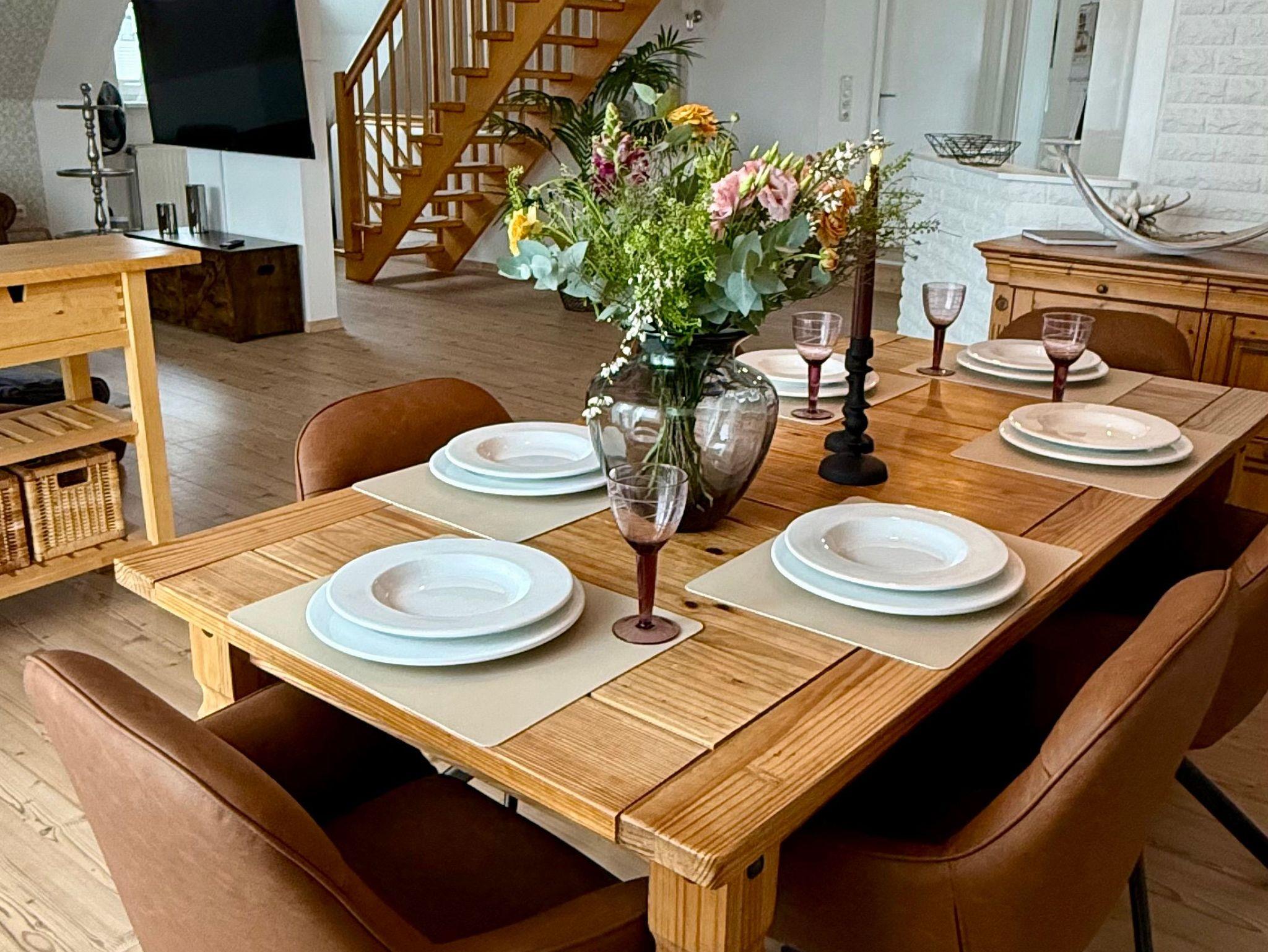 Die Ferienwohnung ist modern eingerichtet und voll ausgestattet. Auf 120qm finden bis 6 Personen eine gemütliche Unterkunft zum Wohlfühlen vor. Ein Babybett steht ebenfalls zur Verfügung. Der große Süd-Balkon lädt zum Verweilen ein. Bettwäsche, Handtücher und WLAN sind vorhanden.