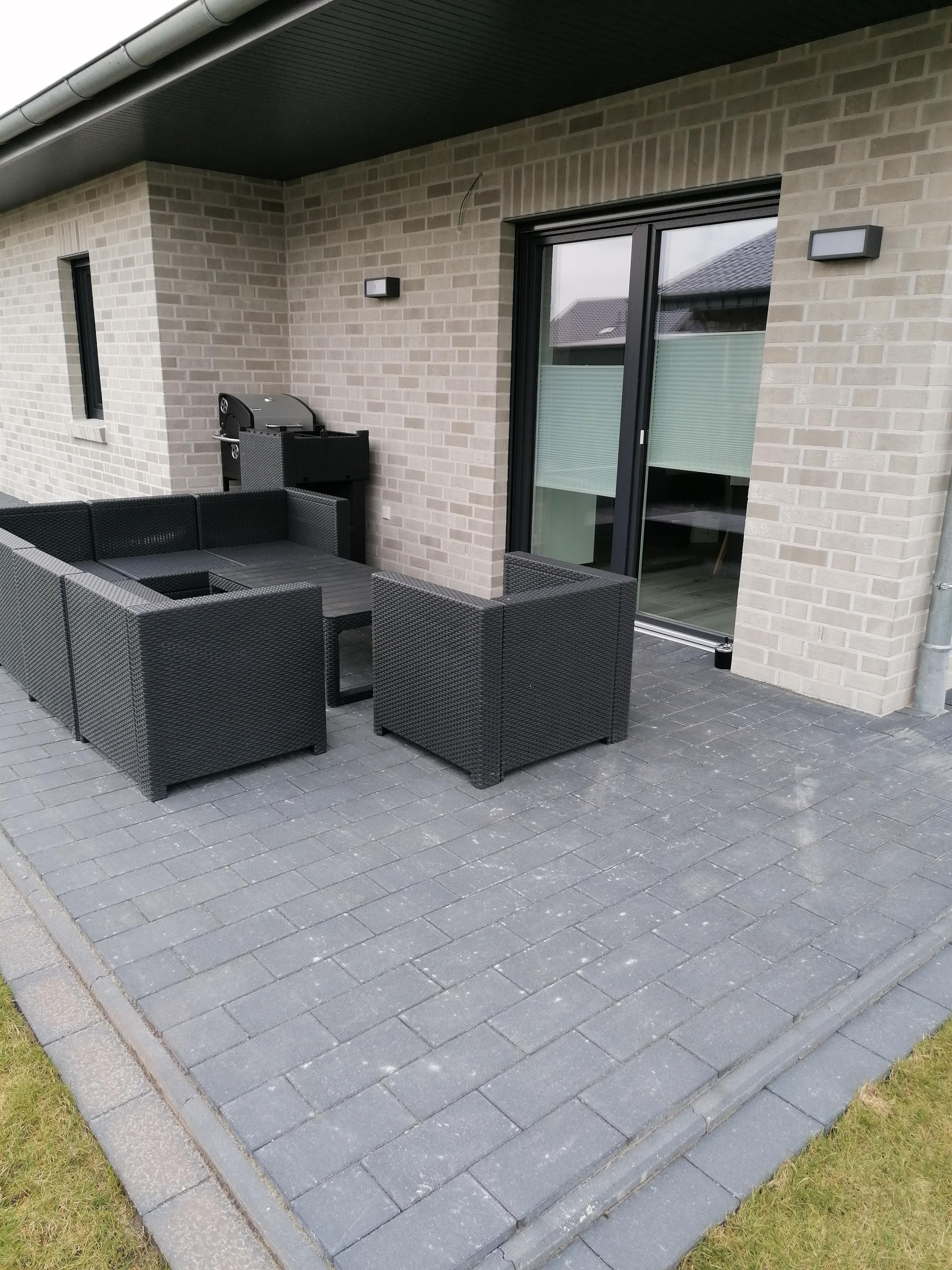 Terrasse mit Gartenmöbel und Holzkohle Grill, auch für Schaschlikspieße geeignet.