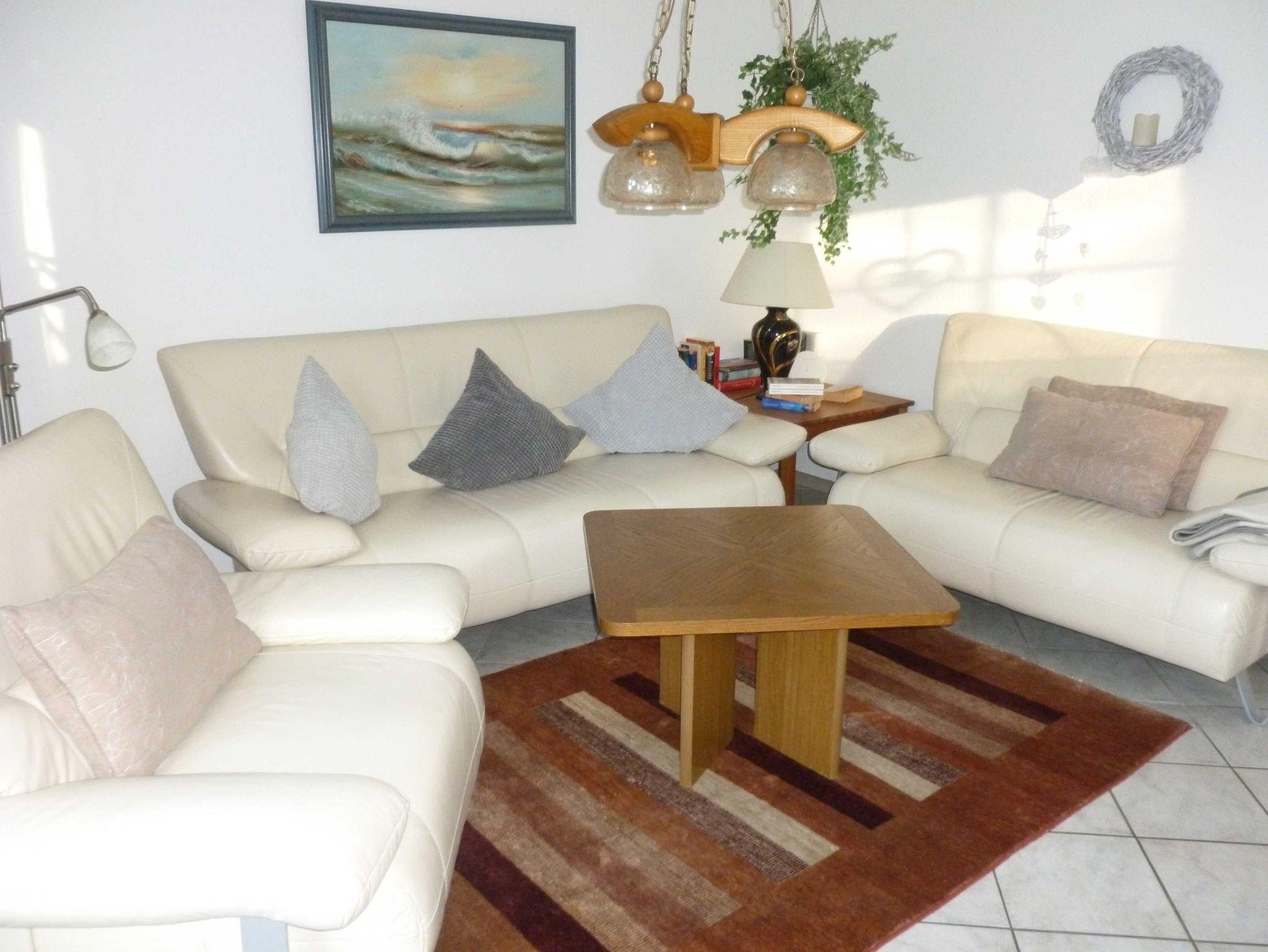 • Wohnzimmer mit Essecke, Radio und SAT-TV vorhanden. Eine große Schiebetür führt direkt auf die mit einer Hecke eingefasste eigene Terrasse.