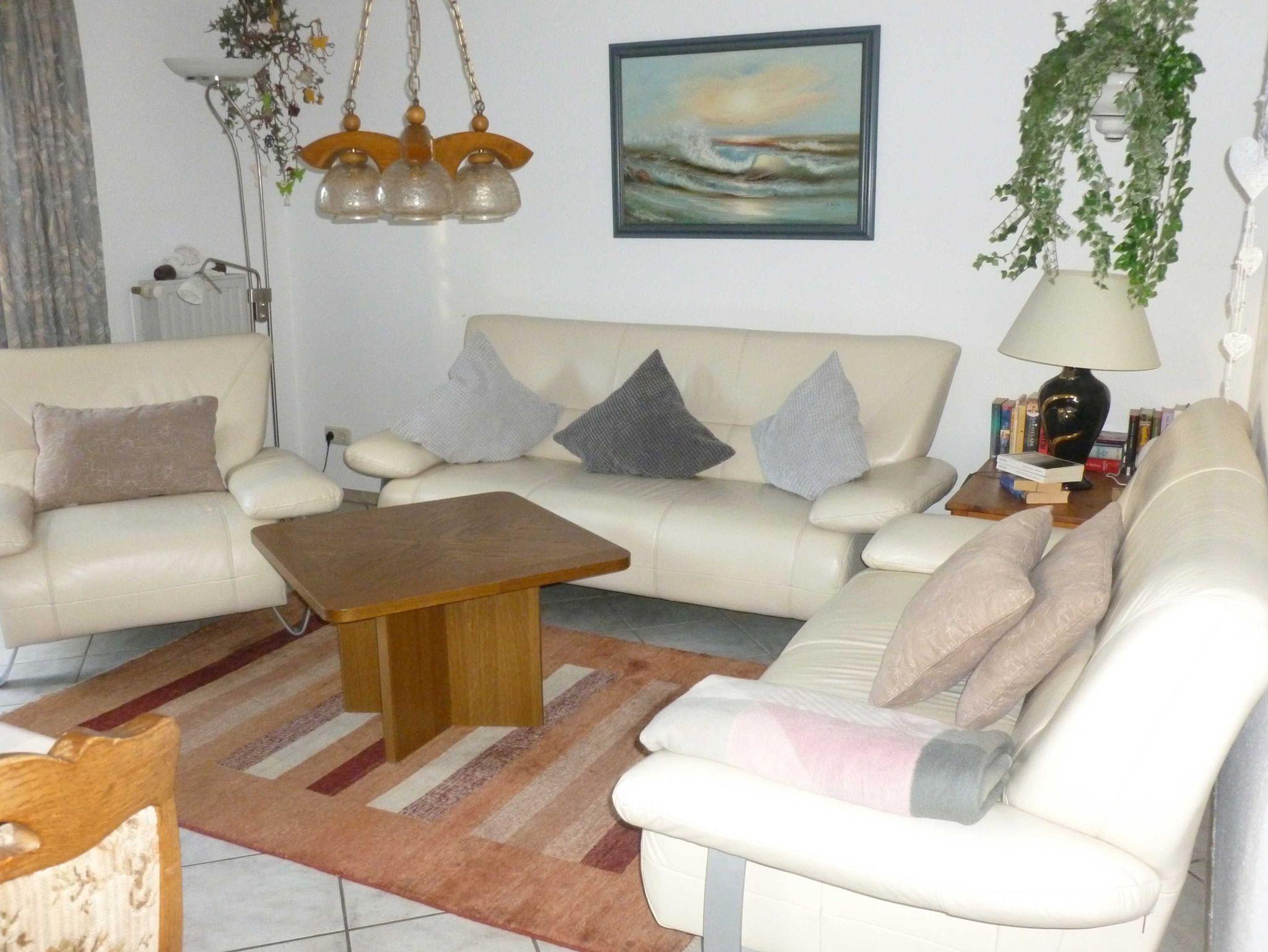 • Geschmackvoll eingerichtetes Wohnzimmer mit SAT-TV, Videorecorder und Radio, Couchgarnitur.