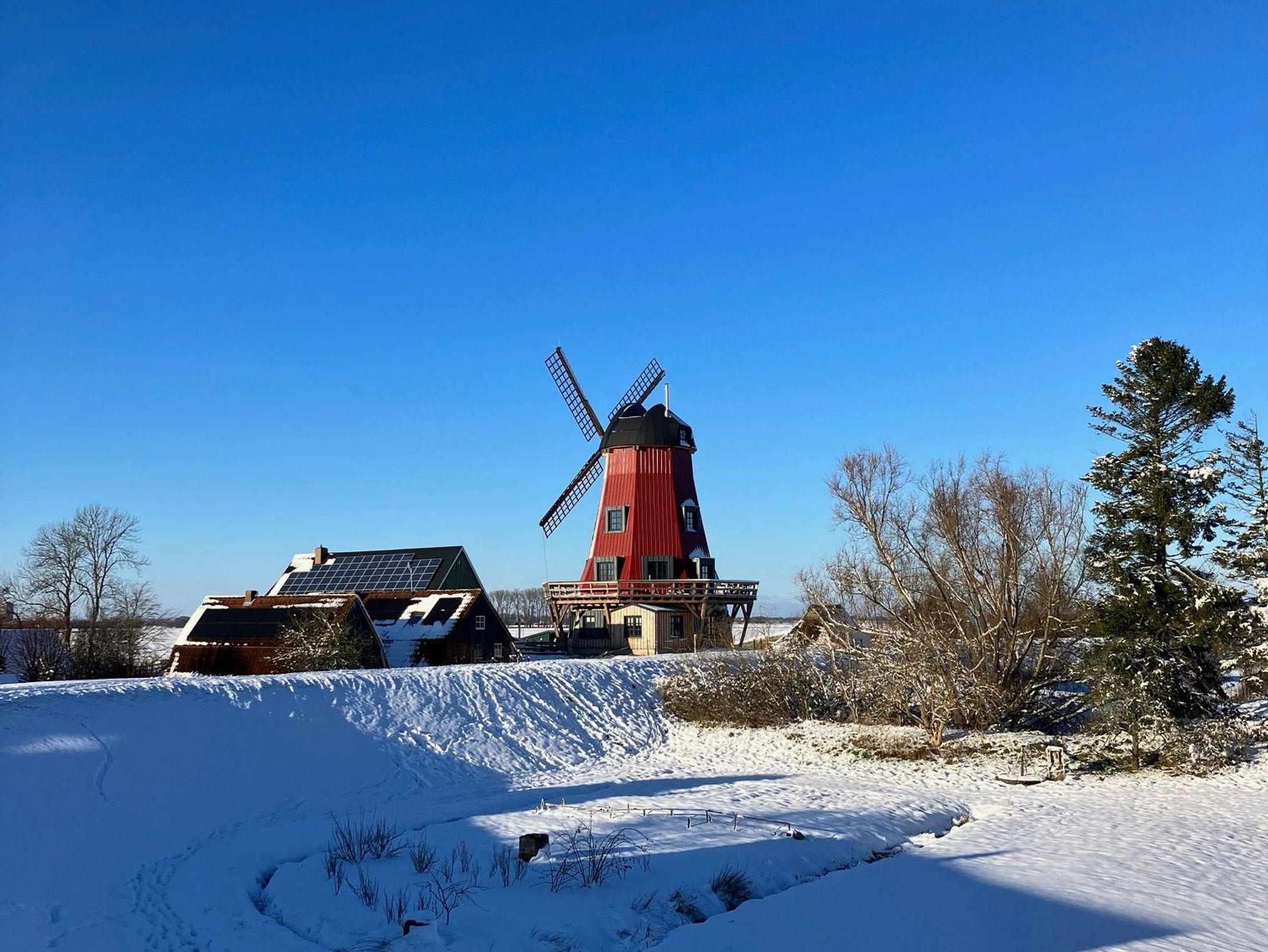Die neu aufgebaute Mühle am Deich der Stör bietet moderne Ferienwohnung mit Elb- und Nordseeblick nahe Hamburg.