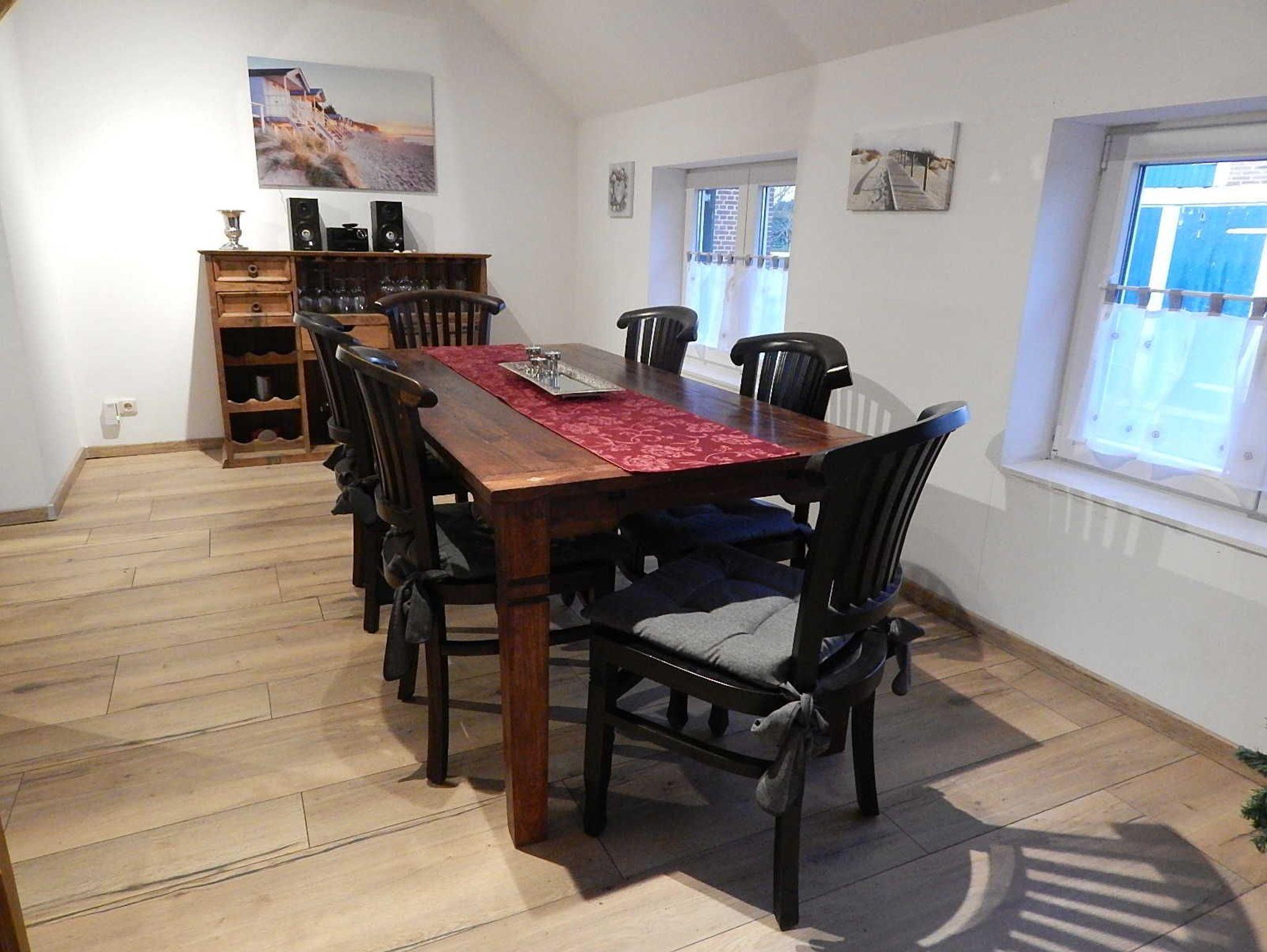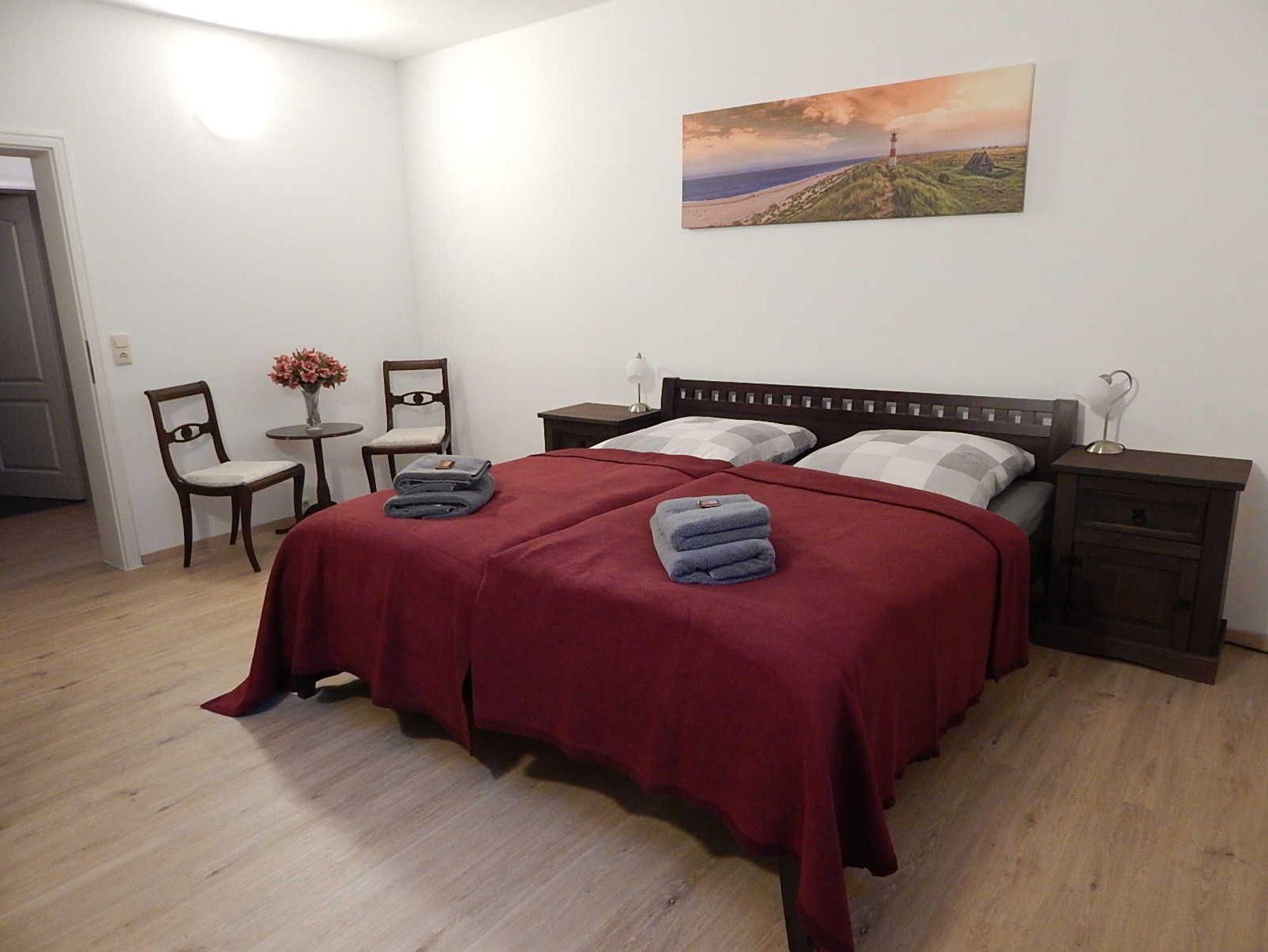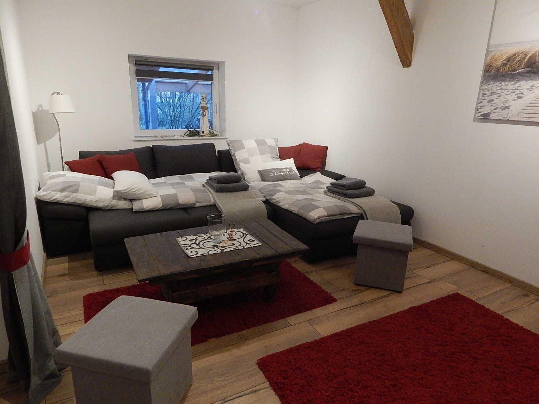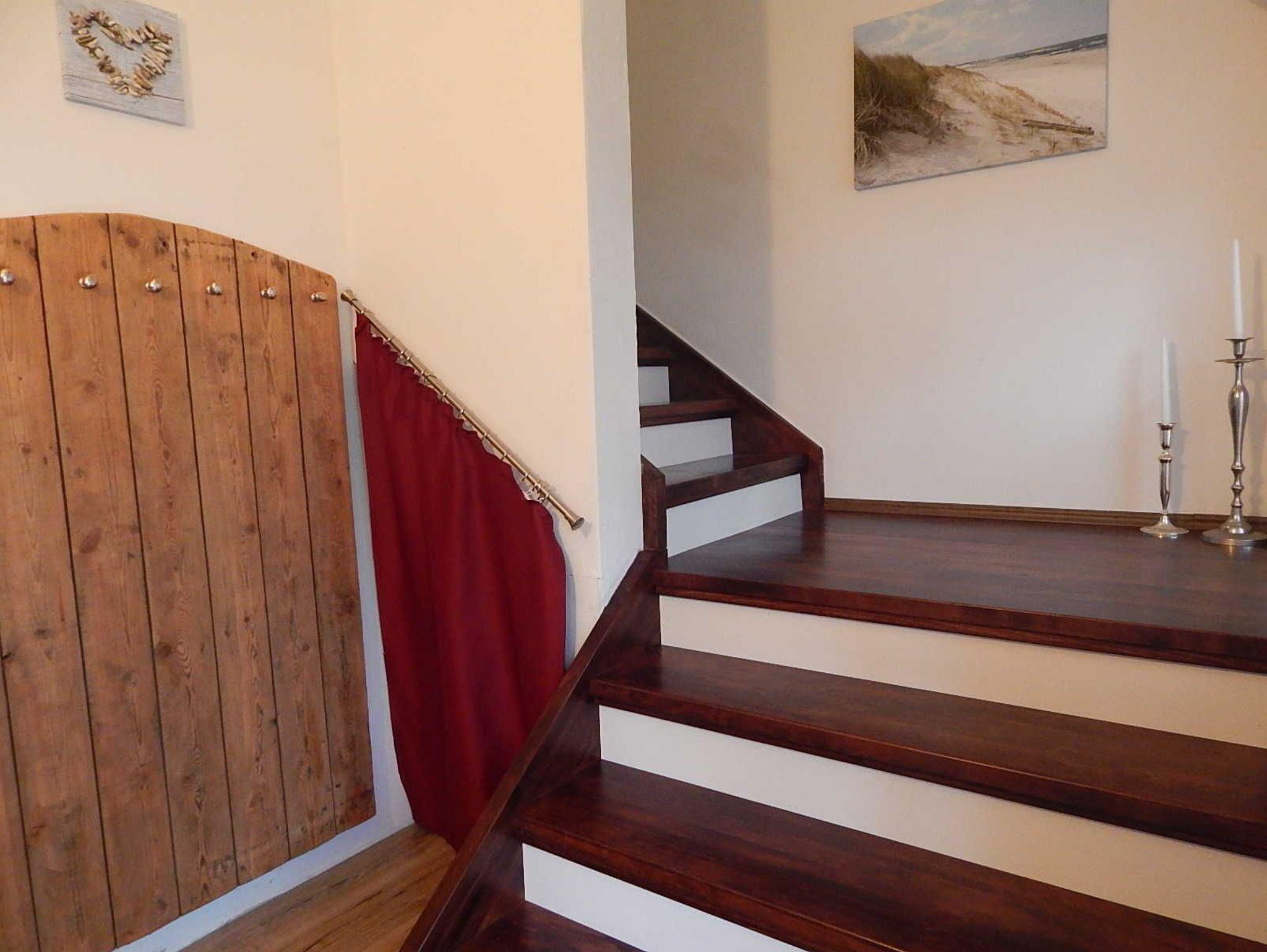 Die Ferienwohnung Nordsee ist in großzügiger Raumgestaltung über 2 Ebenen aufgeteilt. Im Untergeschoss befindet sich die Küche sowie das Wohn- und Esszimmer. Außerdem bietet das Untergeschoss ein großes Schlafzimmer mit Doppelbett (180x200) und einem Badezimmer, welches durch den Flur vom Schlafzimmer getrennt ist. Die Waschmaschine und der Trockner befinden sich im Badezimmer. Für den 7. und 8. Gast (10,- € pro Tag und Gast zusätzlich) steht im Wohnzimmer ein Schlafsofa zur Verfügung. Gegen Aufpreis (20,- € einmalig) bieten wir eine Babyausstattung an (Babyreisebett mit Wickelauflage, Hochstuhl, Spielecke und Kleinkindspielzeug.