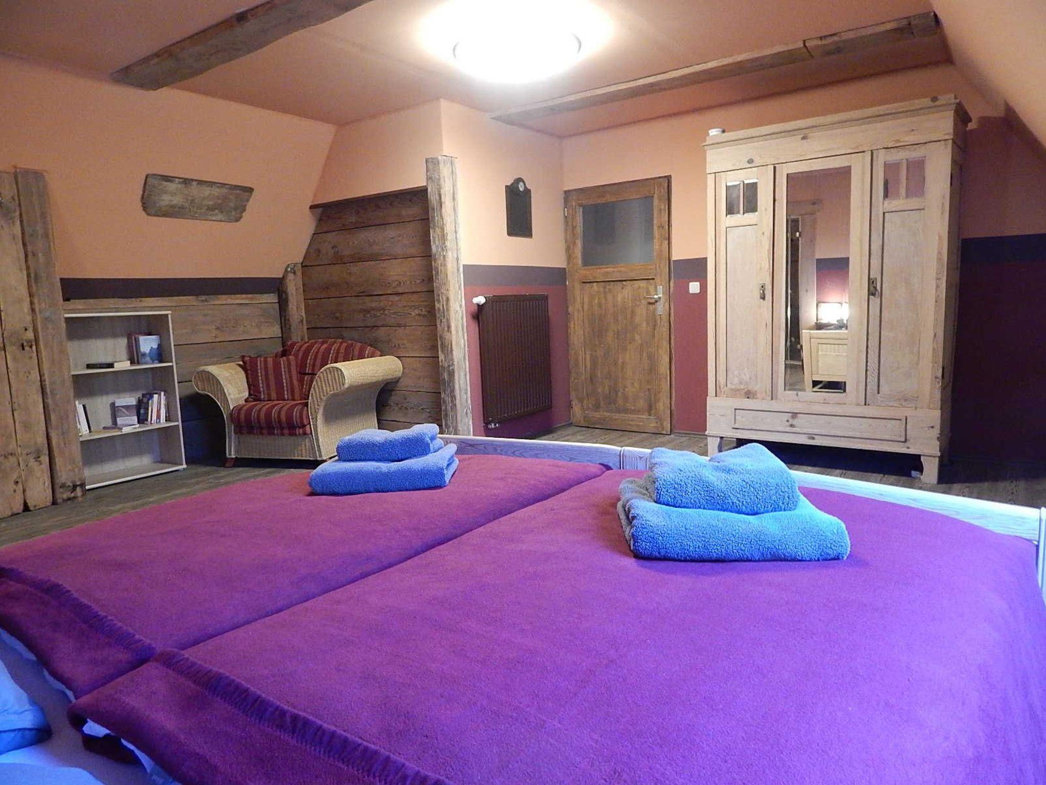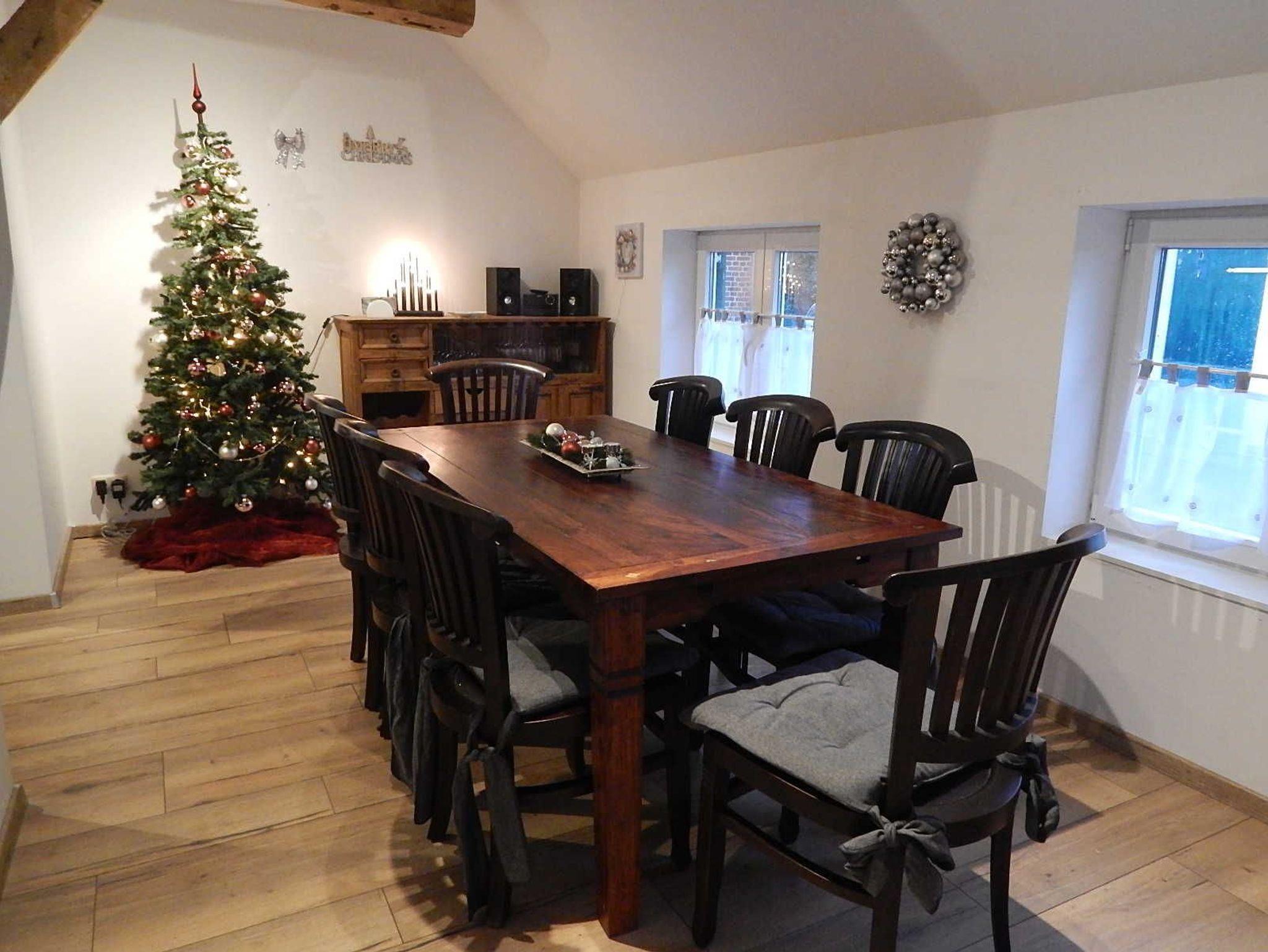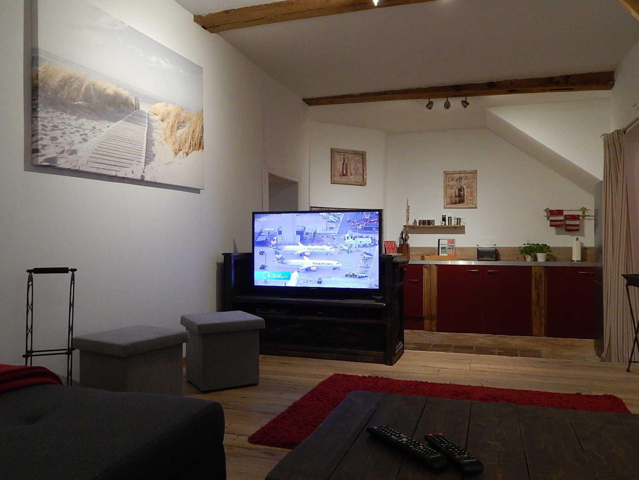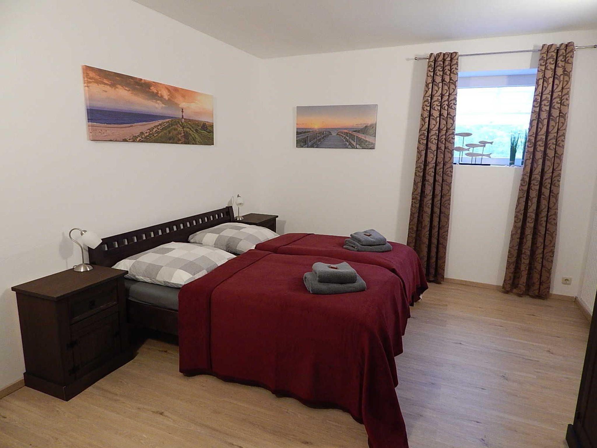 Die Ferienwohnung Nordsee ist in großzügiger Raumgestaltung über 2 Ebenen aufgeteilt. Im Untergeschoss befindet sich die Küche sowie das Wohn- und Esszimmer. Außerdem bietet das Untergeschoss ein großes Schlafzimmer mit Doppelbett (180x200) und einem Badezimmer, welches durch den Flur vom Schlafzimmer getrennt ist. Die Waschmaschine und der Trockner befinden sich im Badezimmer. Für den 7. und 8. Gast (10,- € pro Tag und Gast zusätzlich) steht im Wohnzimmer ein Schlafsofa zur Verfügung. Gegen Aufpreis (20,- € einmalig) bieten wir eine Babyausstattung an (Babyreisebett mit Wickelauflage, Hochstuhl, Spielecke und Kleinkindspielzeug.