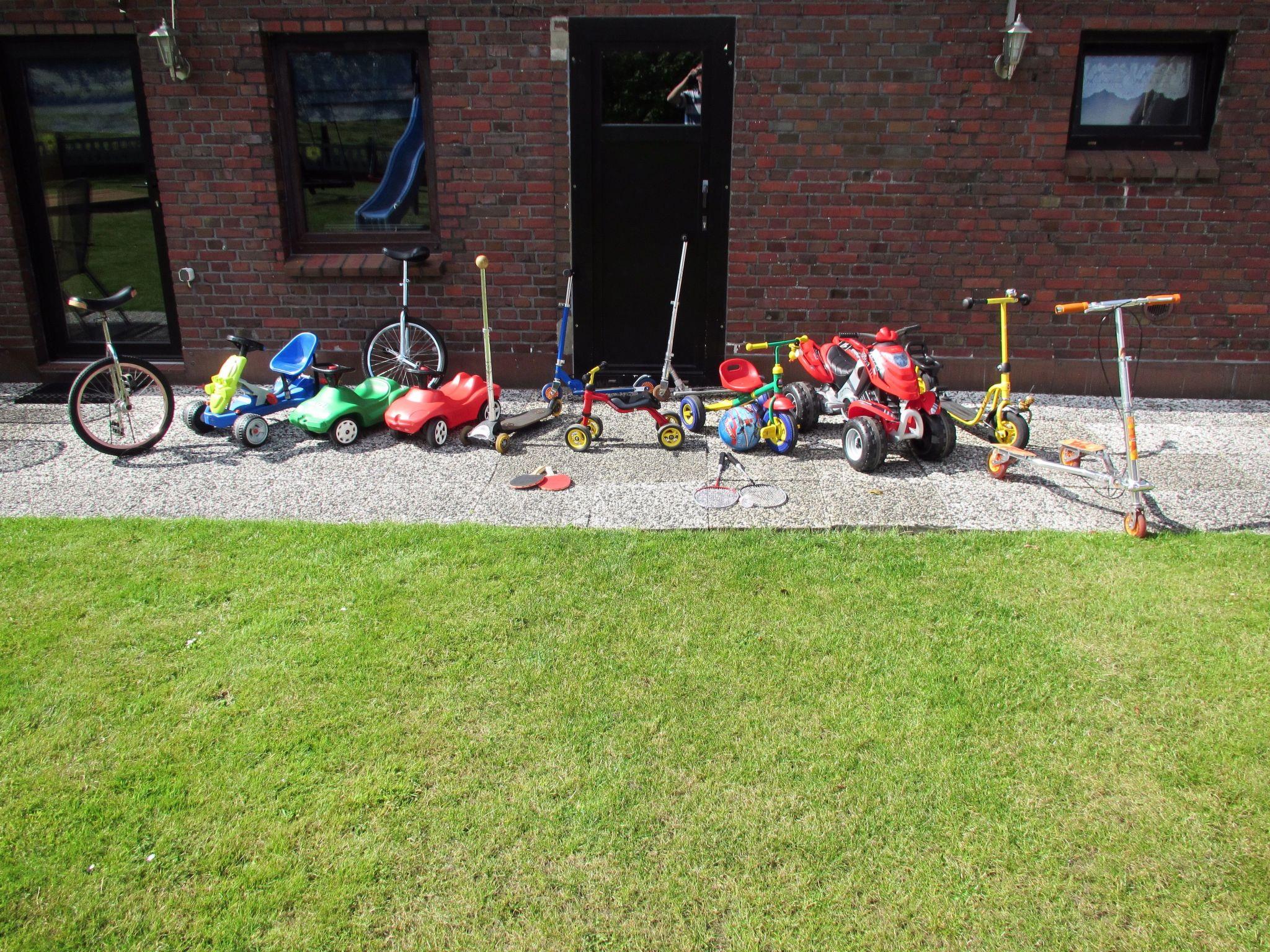 Der Außenbereich des Landhauses verzaubert mit einem großzügigen Garten, der reichlich Spiel- und Entspannungsmöglichkeiten bietet, darunter Fußballtore, ein Trampolin, Schaukeln und eine Liegewiese. Kinder kommen im umfangreichen Kinderfuhrpark voll auf ihre Kosten, während die Erwachsenen die Sonne auf gemütlichen Gartenliegen genießen oder den Holzkohlengrill für gesellige Abende anwerfen können. Ein eigener Stellplatz direkt neben dem Haus erspart Parkplatzsorgen.