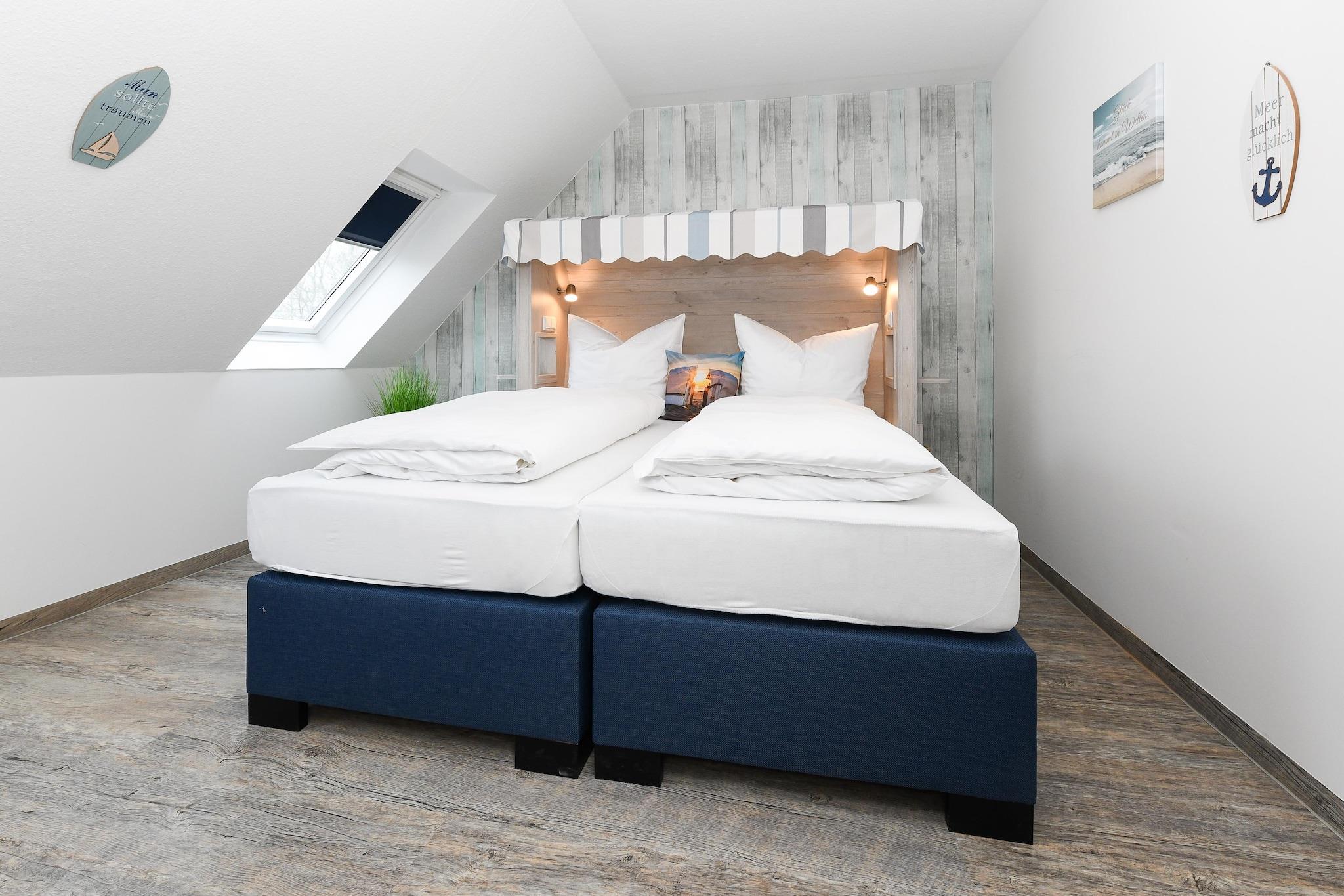 Gemütliche Ferienwohnung im Obergeschoss in Bensersiel mit zwei Schlafzimmern und Garten für erholsamen Familienurlaub an der Nordsee.