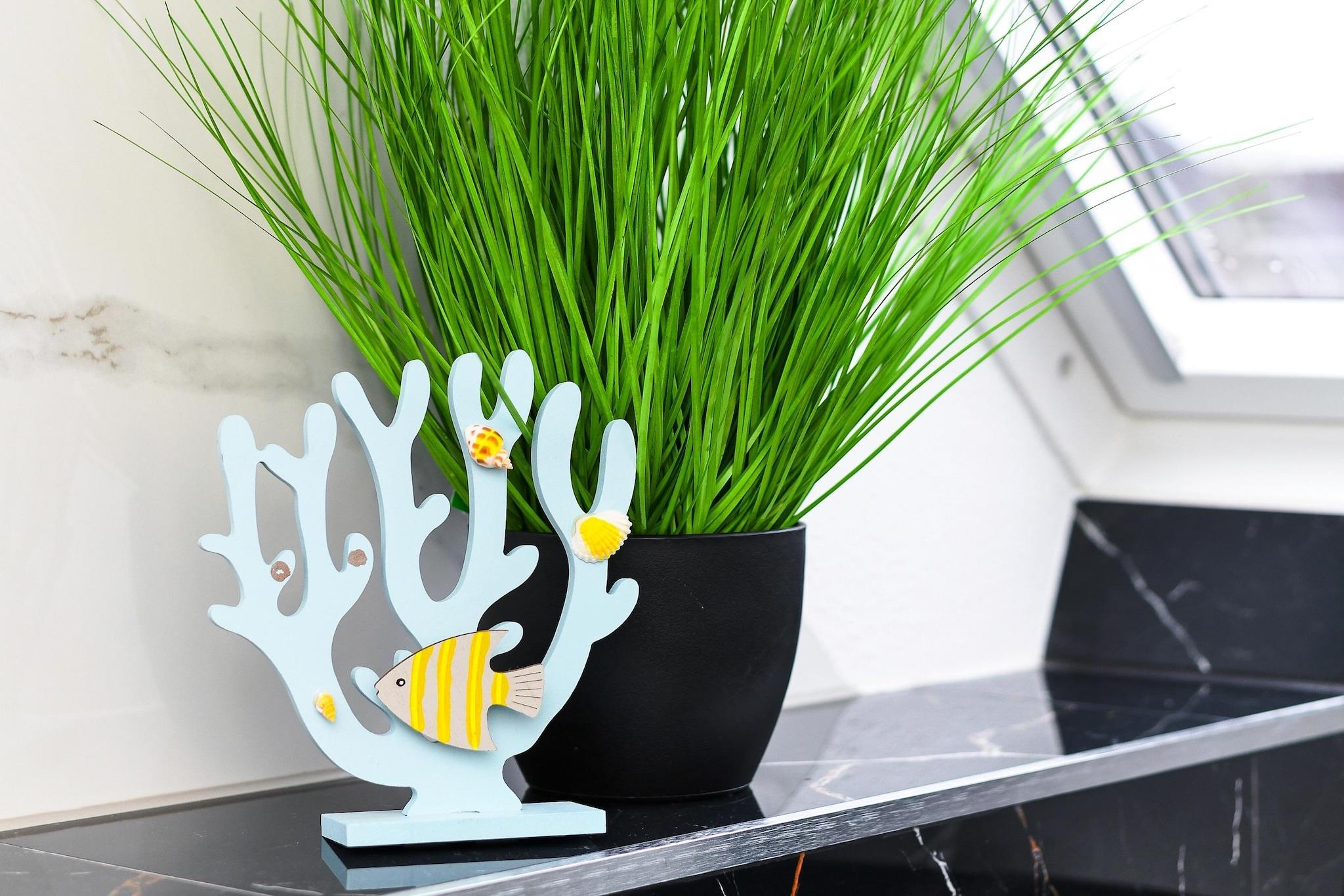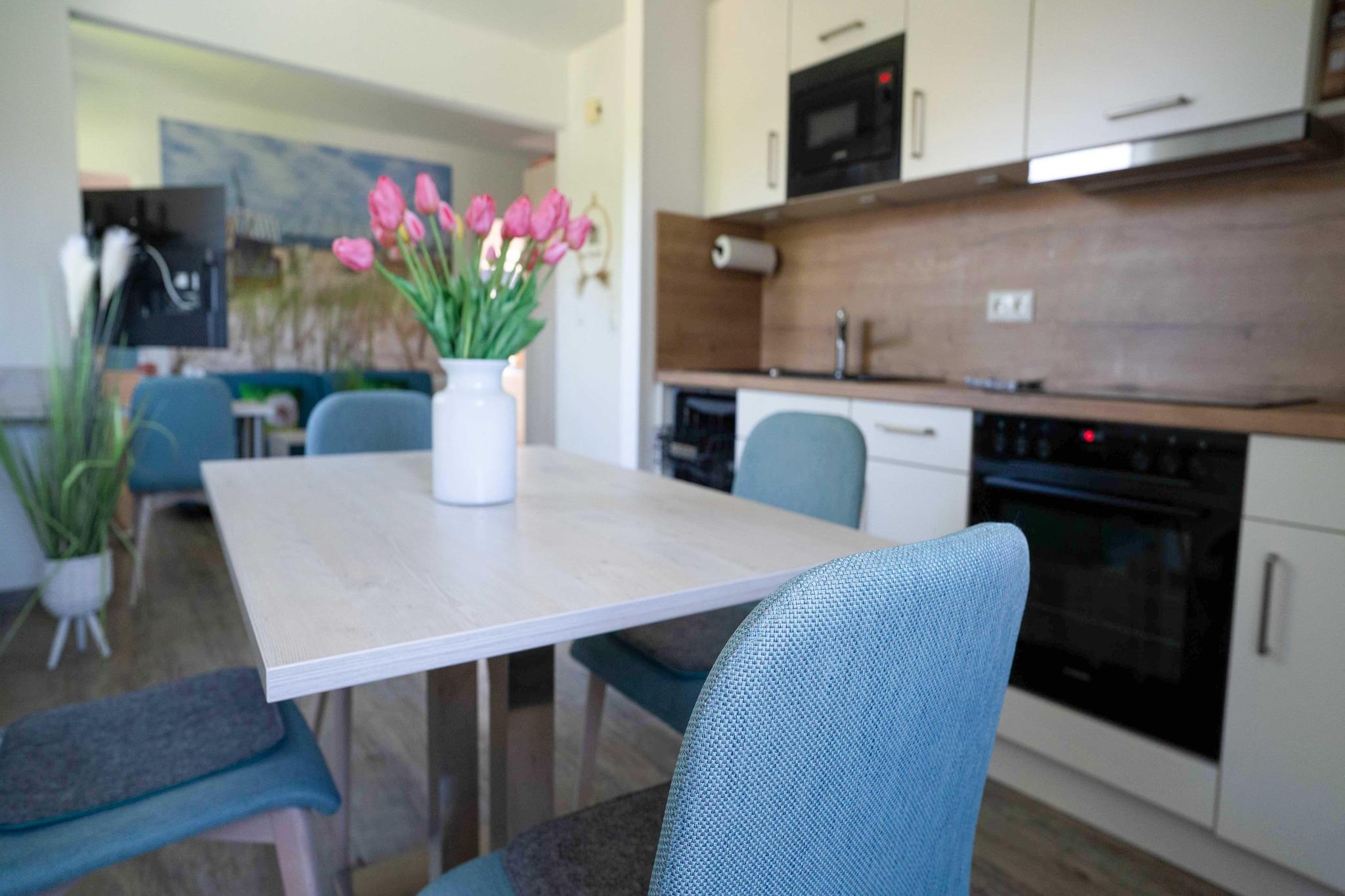 Helle Ferienwohnung in Bensersiel mit 2 Schlafzimmern, moderner Küche und Garten, nur wenige Gehminuten vom Strand entfernt.