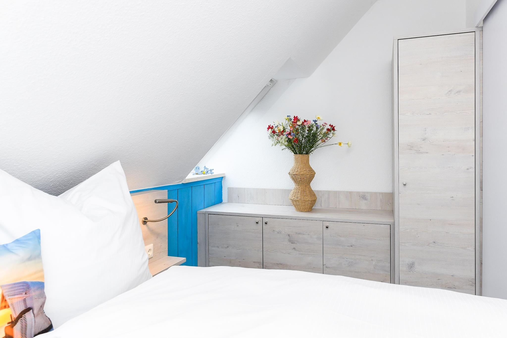 Diese liebevoll eingerichtete Ferienwohnung im Obergeschoss bietet auf ca. 60?m² ausreichend Platz für bis zu 4 Personen und ein zusätzliches Kleinkind. Zwei separate Schlafzimmer – eines davon ideal als Kinderzimmer nutzbar – sowie ein heller Wohnbereich mit offener Küche sorgen für ein angenehmes Urlaubsgefühl. Die moderne Küche ist mit allen wichtigen Geräten ausgestattet und lädt zum gemeinsamen Kochen und Essen ein. Das stilvolle Badezimmer mit Dusche und WC ist praktisch und hochwertig ausgestattet. WLAN, ein Flachbild-TV und bequeme Matratzen runden den Komfort ab. Im Gartenbereich hinter dem Haus gibt es viel Platz zum Spielen und Entspannen – perfekt für Familien mit Kindern. Waschmaschine und Trockner stehen im Haus zur gemeinschaftlichen Nutzung bereit. Die ruhige Lage in Bensersiel, nur wenige Gehminuten vom Strand entfernt, macht diese Unterkunft zum idealen Ort für erholsame Urlaubstage an der Nordseeküste. Highlights: WLAN, verbrauchsabhängige Energiekosten und Wäschepaket inklusive. Hinweis zur Endreinigung: Bei einem Aufenthalt von unter 5 Nächten ist eine Gebühr von 80 EURO zu zahlen, ansonsten ist die Endreinigung inklusive.