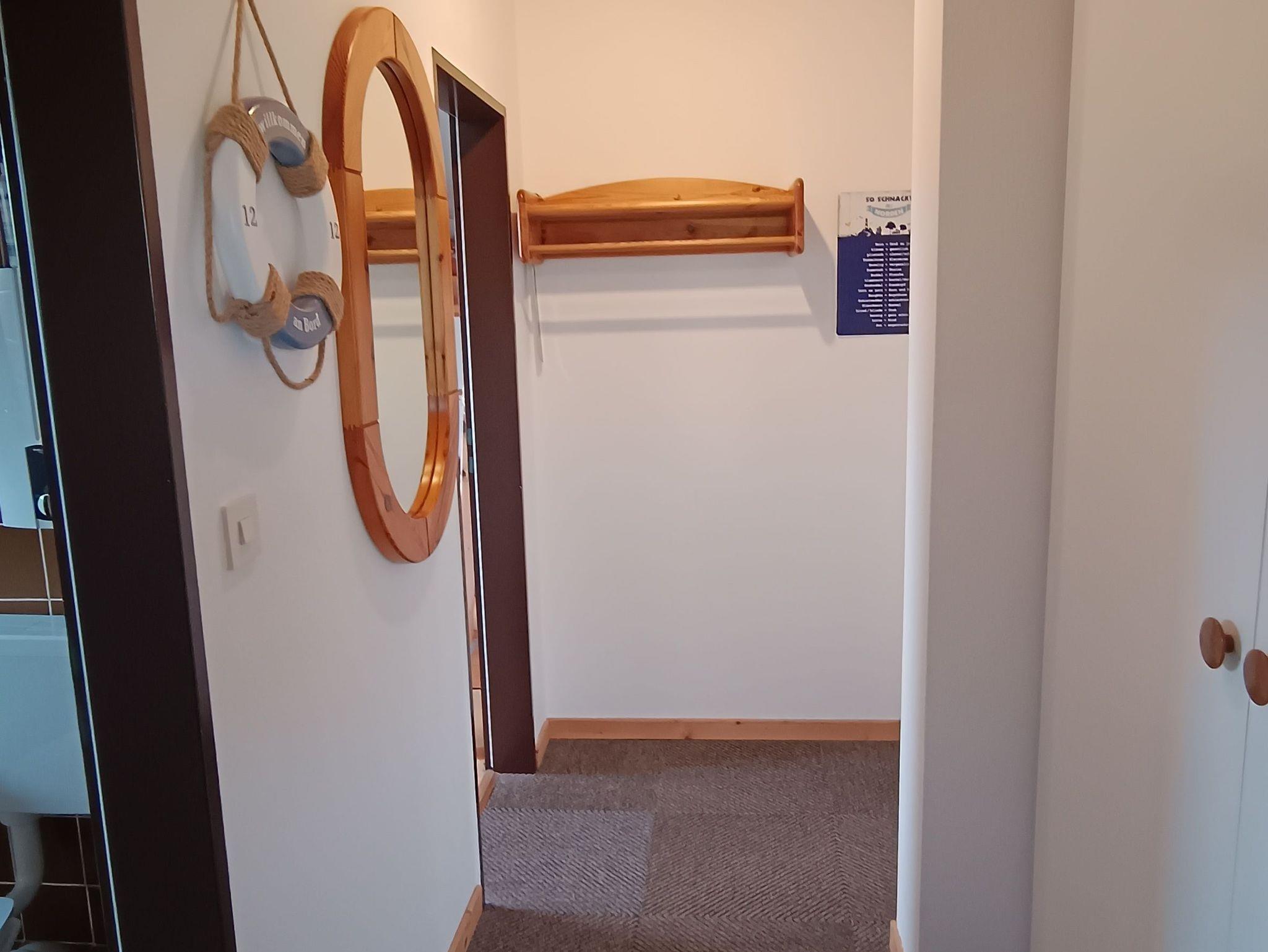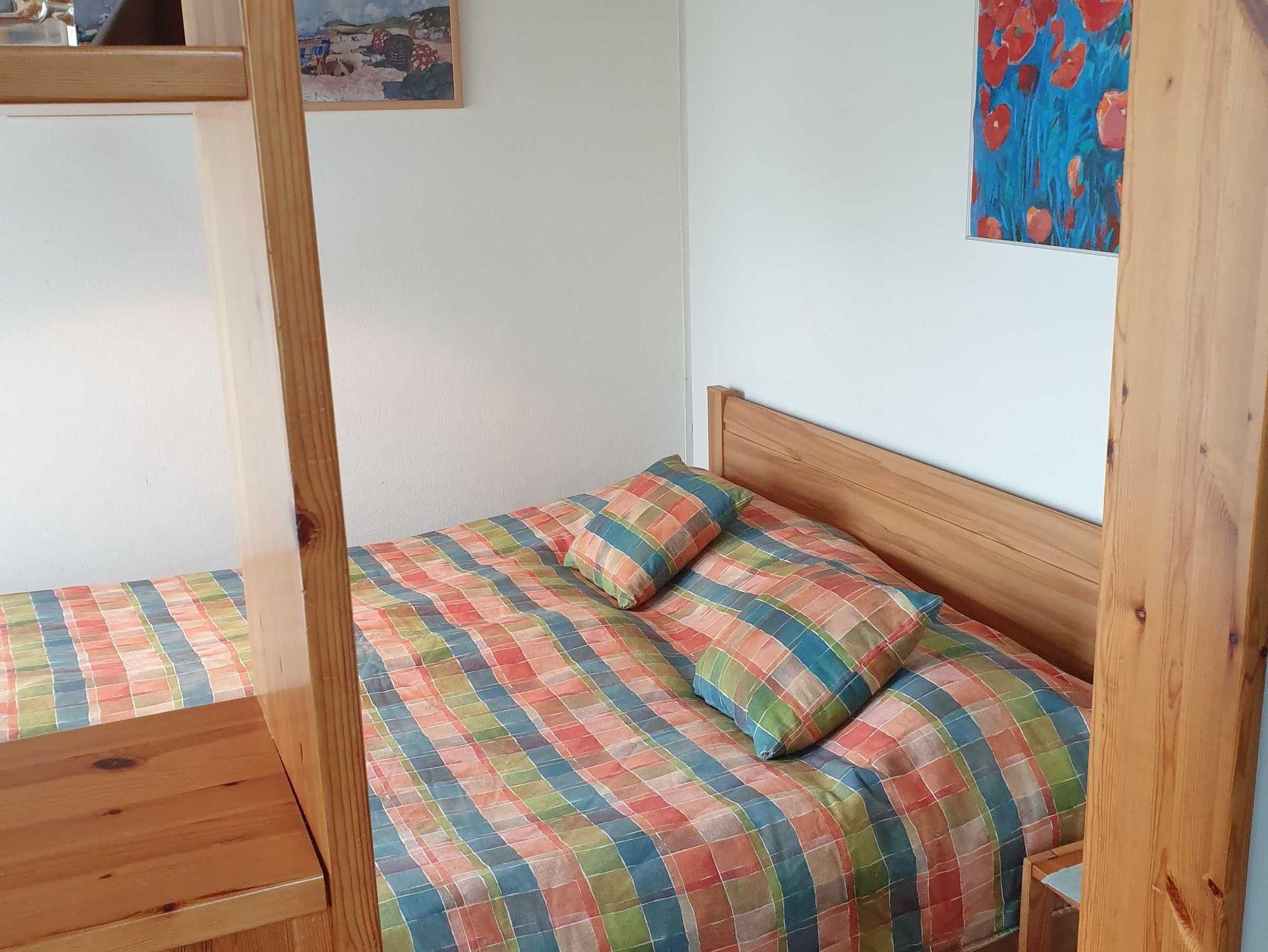 Die Wohnung ist 41 m² groß und besteht aus einem Wohnzimmer mit Küchenzeile und Essecke, einem Schlafraum mit Doppelbett und Balkon sowie einem weiteren Schlafraum mit Etagenbett. Das kleine Bad hat eine Duschkabine. Die Balken der Dachkonstruktion sind freigelegt und steigen auf eine Deckenhöhe von 4 m an. Ein zusätzliches Fenster oben lässt den Wohnbereich hell und großzügig erscheinen. - Bettwäsche und Handtücher sind bitte selbst mitzubringen. -