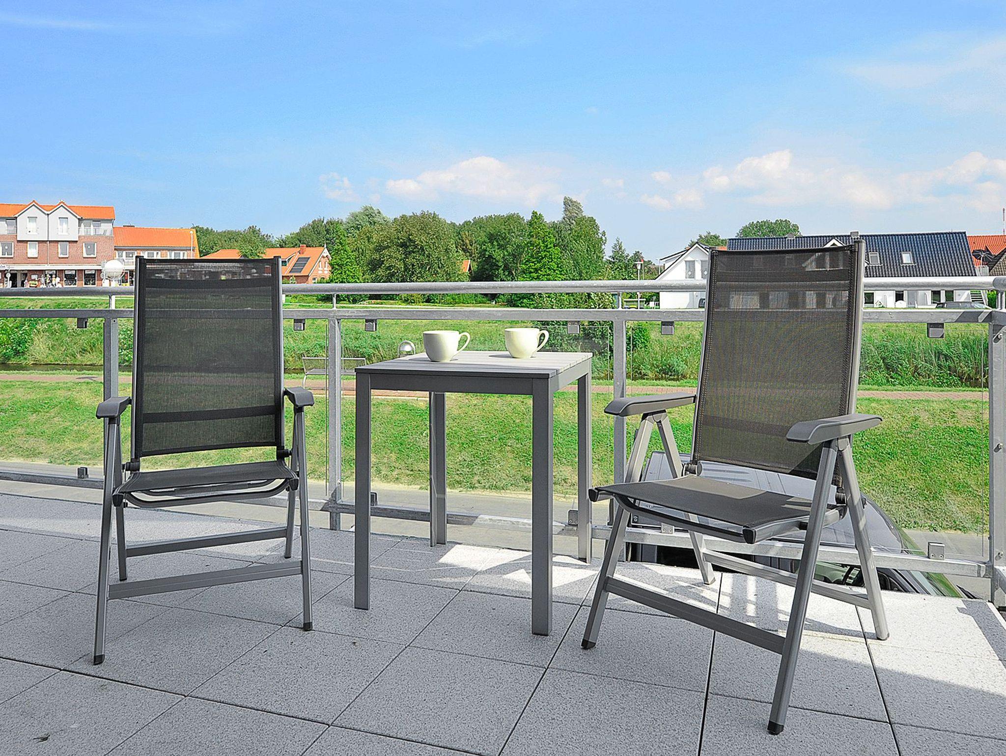 Die moderne Ferienwohnung Deichblick in Bensersiel bietet einen einzigartigen Blick auf das Benser Tief und zwei Balkone.