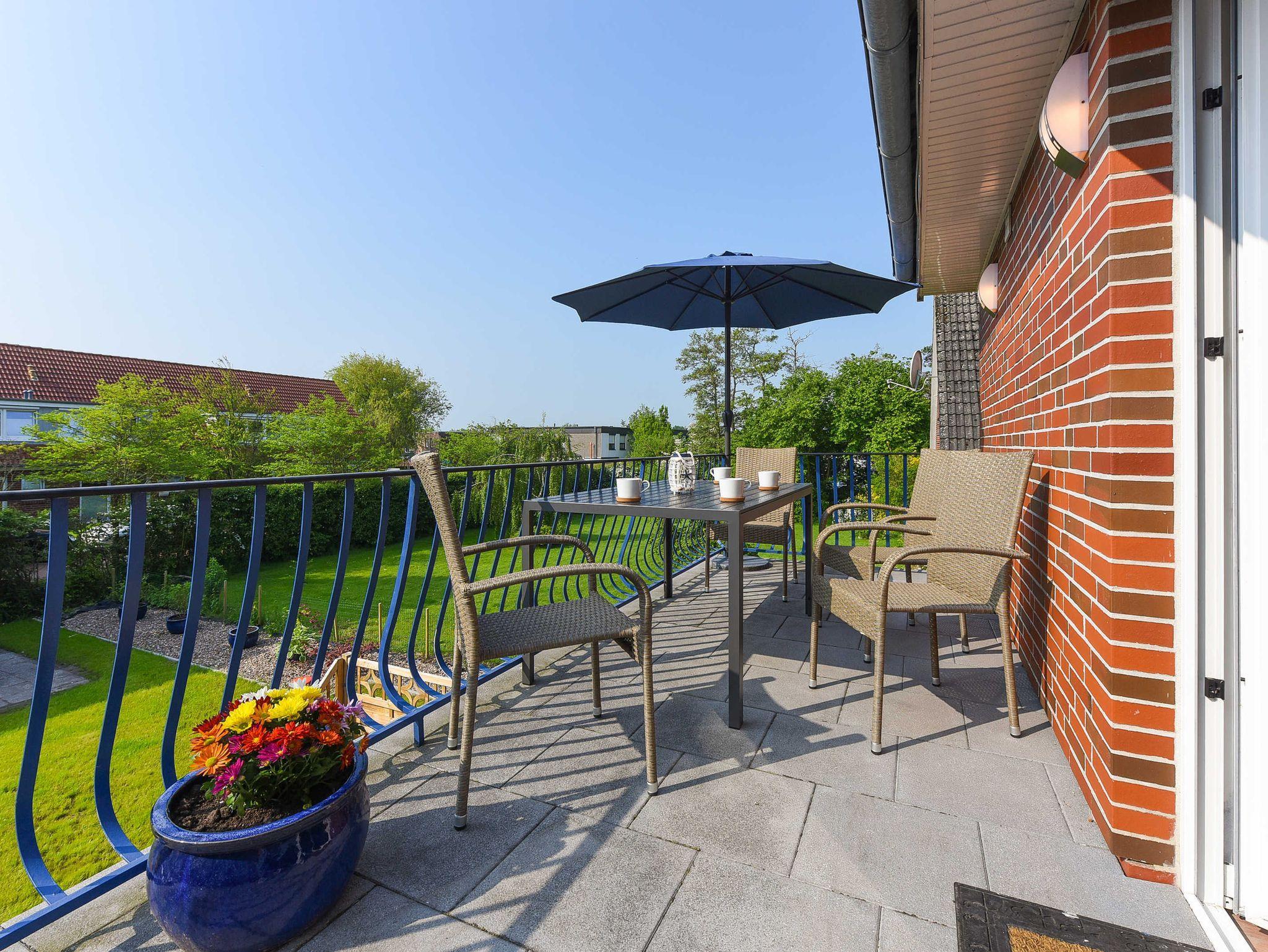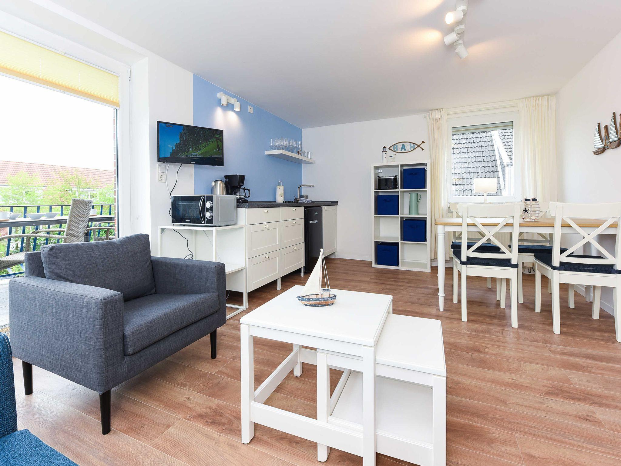 Das Blaue Haus in Bensersiel bietet moderne Ferienwohnungen nur 200 Meter vom Nordseedeich entfernt, ideal für Familienurlaub.