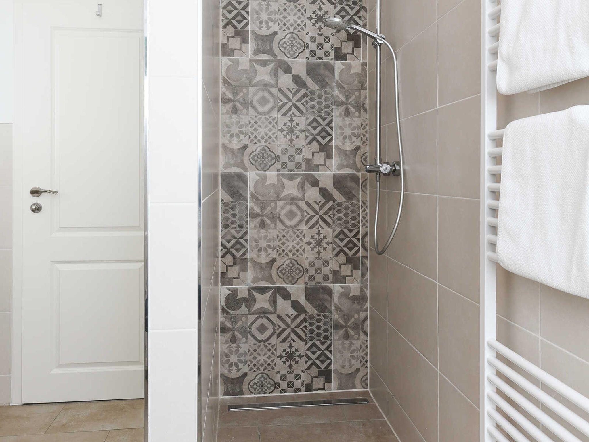 Badezimmer mit Dusche, Waschtisch und WC