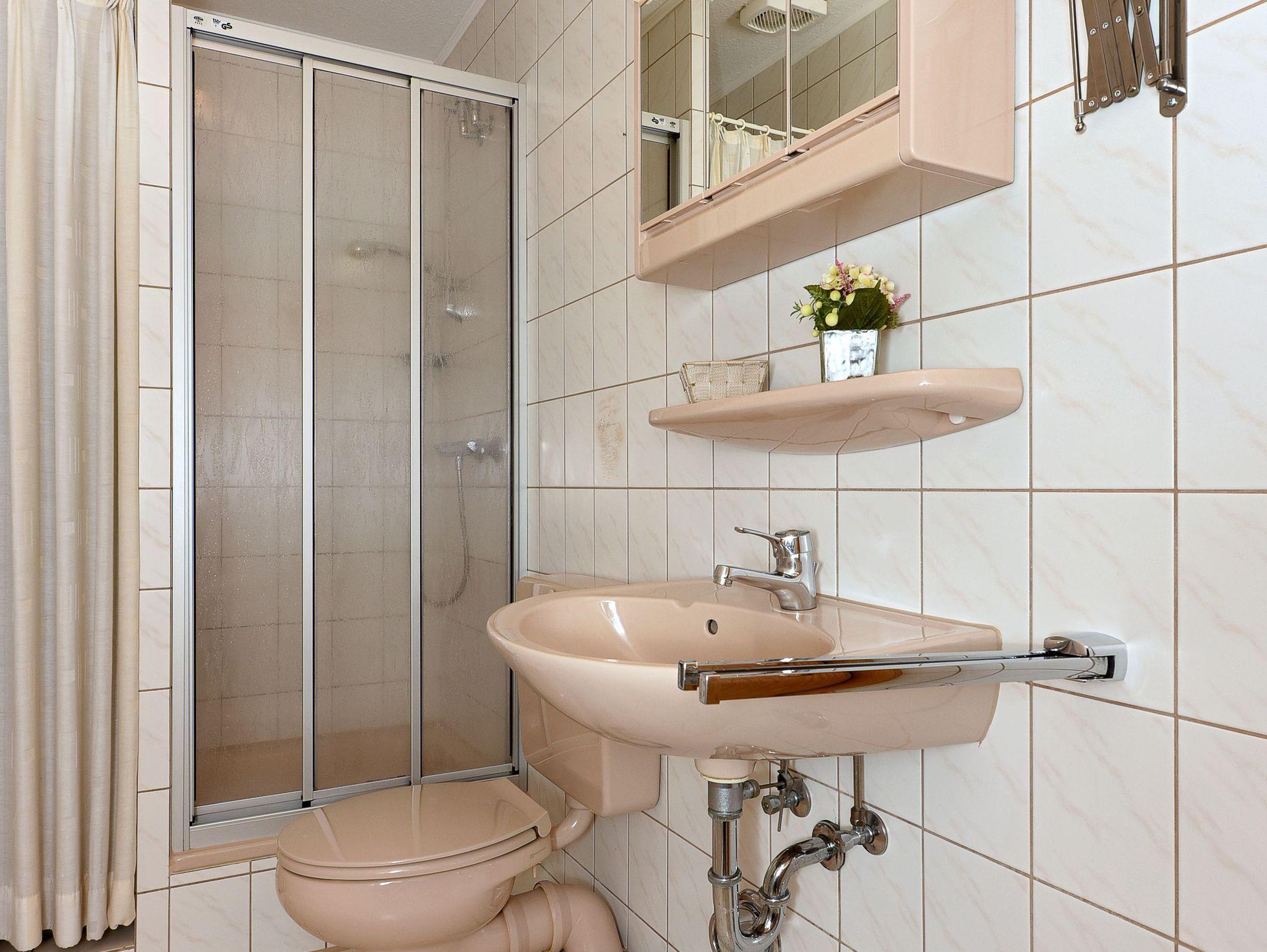 Badezimmer mit Dusche, Waschtisch und WC