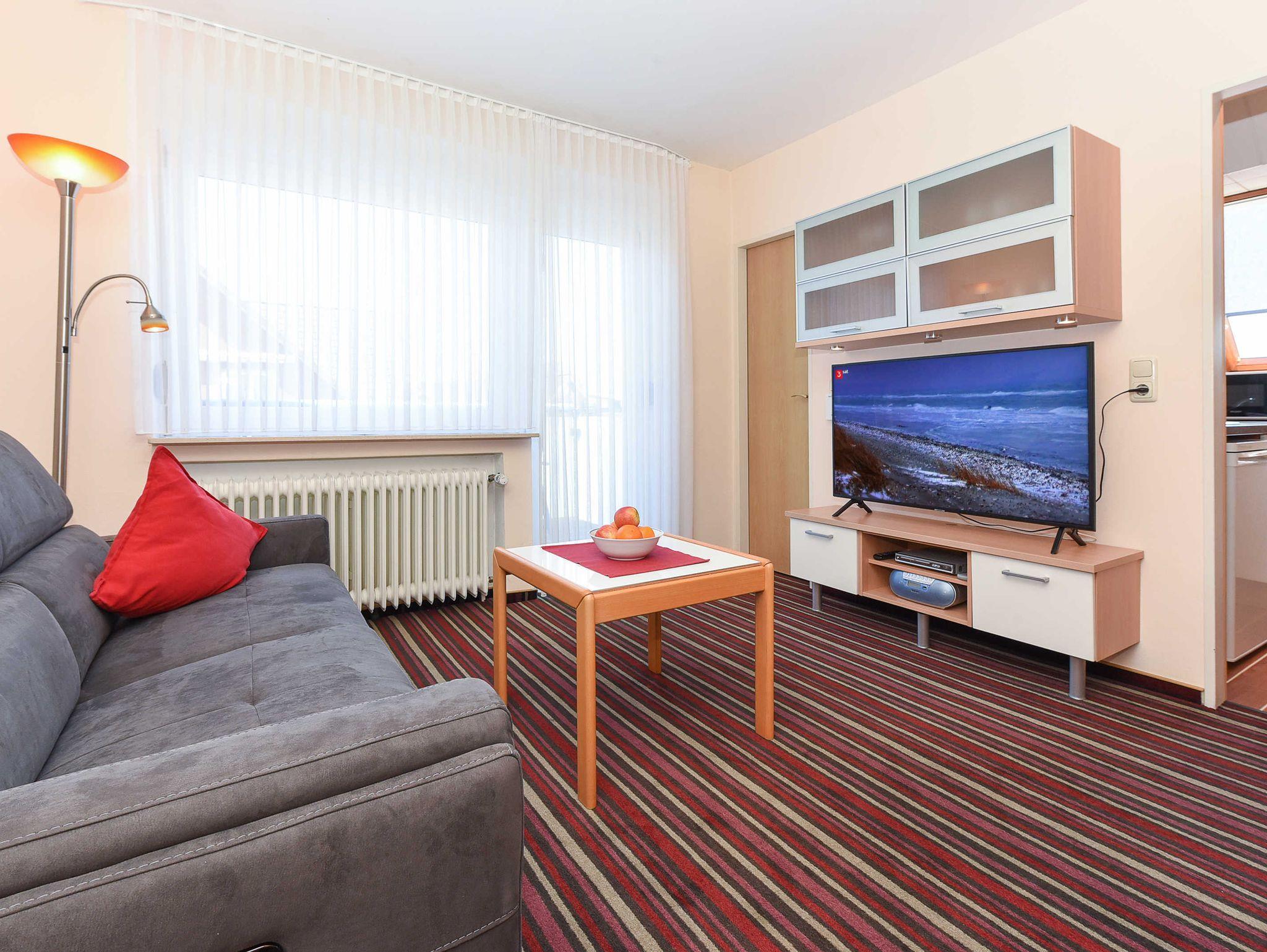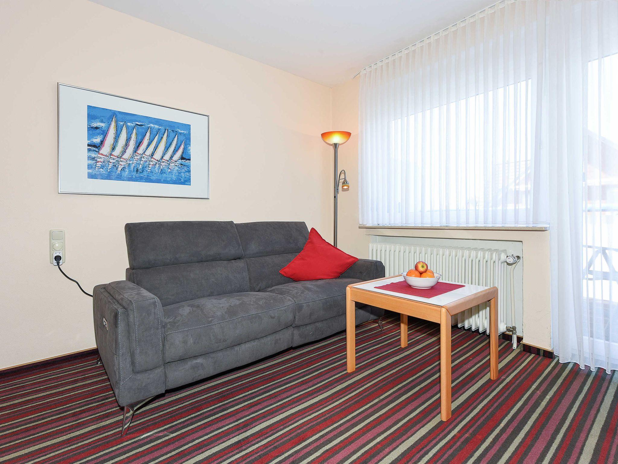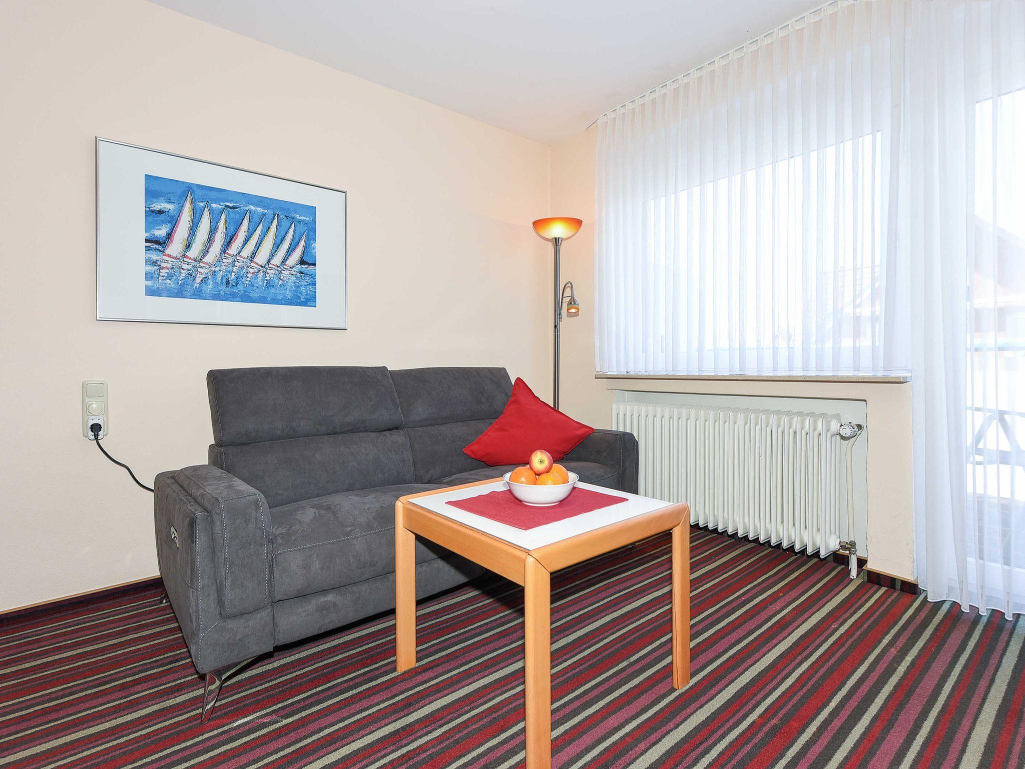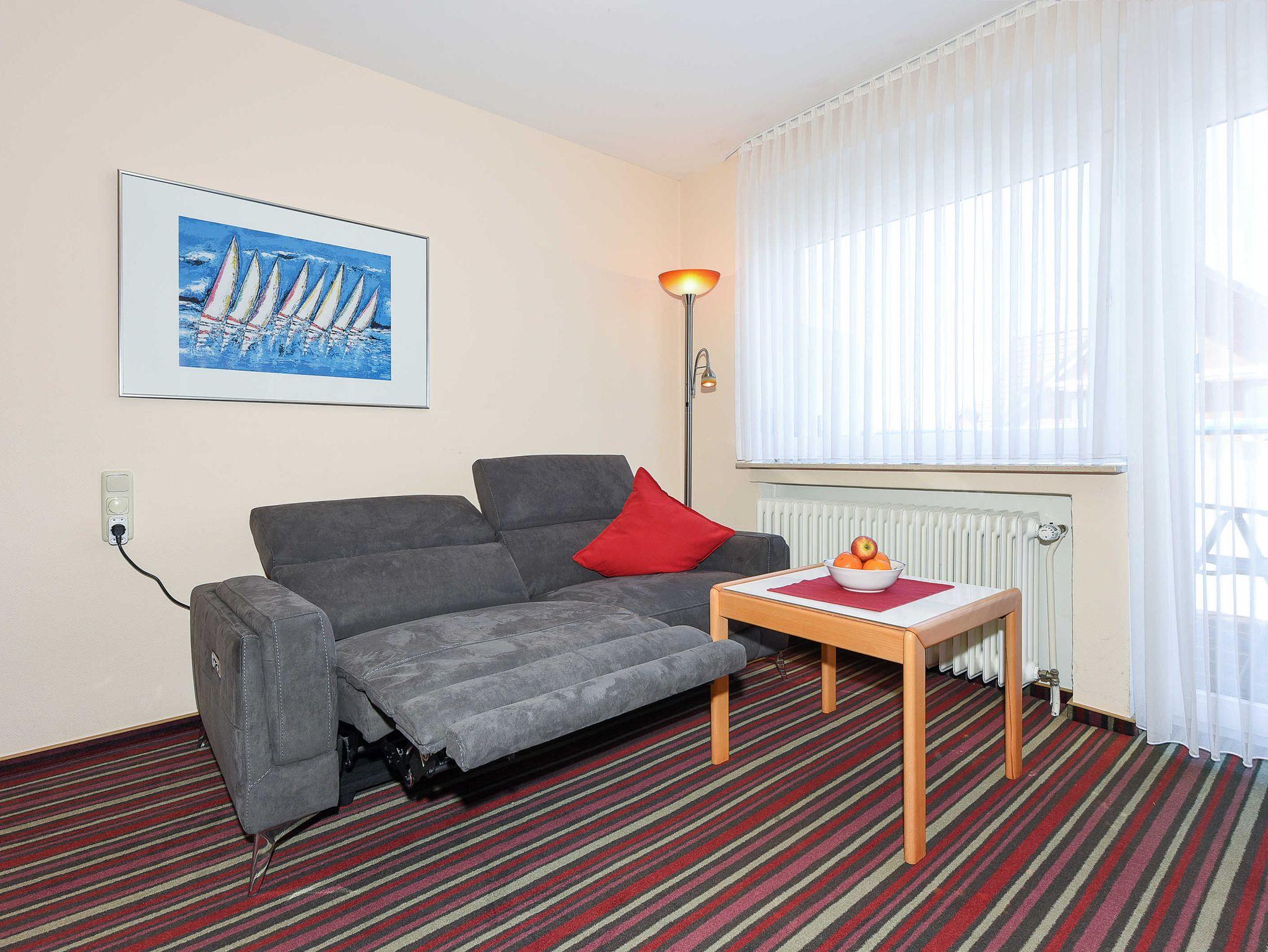 Modernes Apartment im Kapitänshaus Bensersiel mit Balkon, nahe Nordsee und Wellness, ideal für entspannte Urlaubstage.