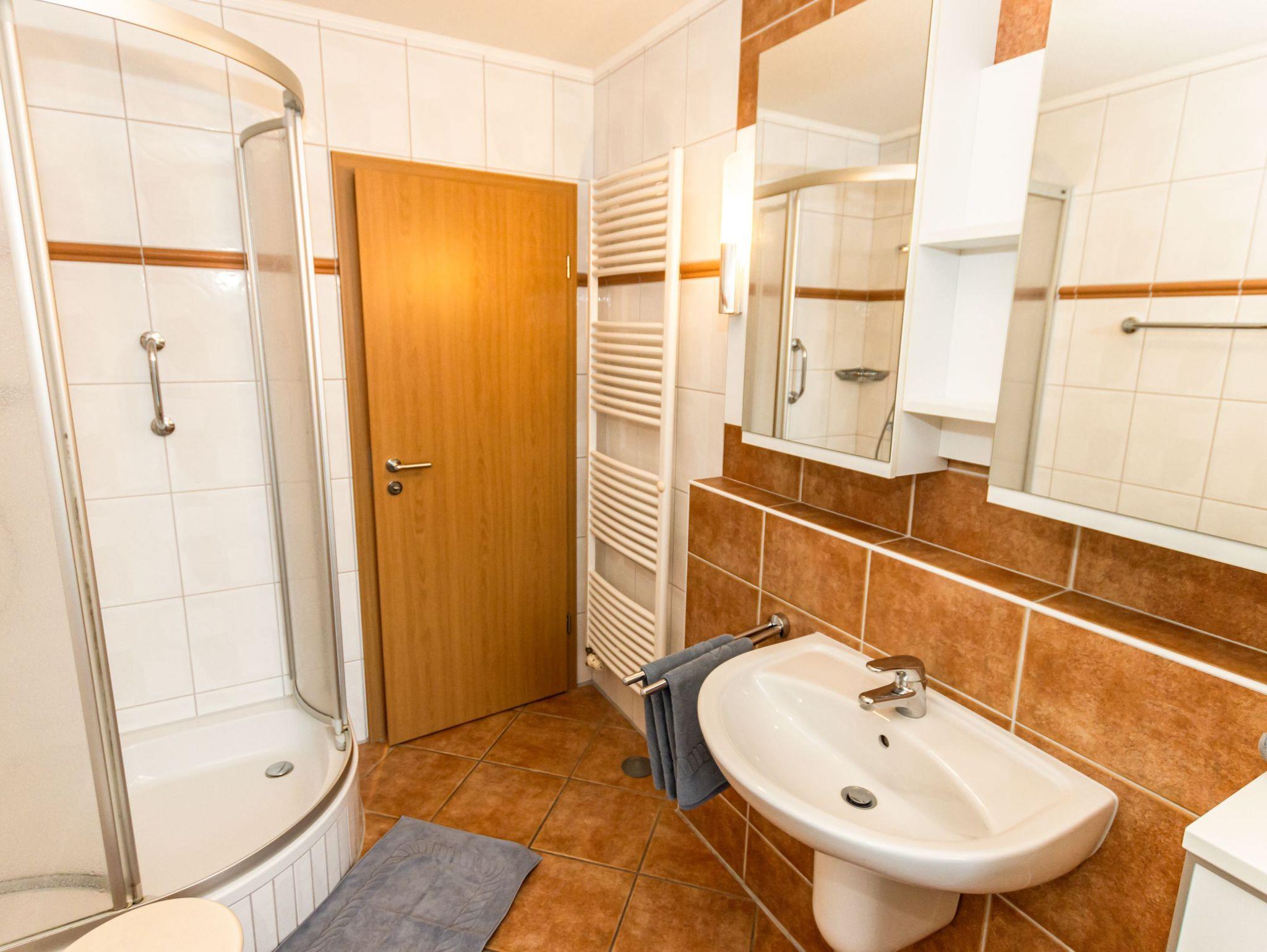 - Badezimmer mit Dusche, Waschtisch und WC