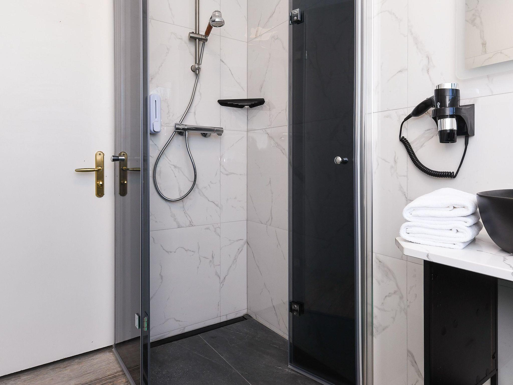 Badezimmer mit Dusche, Waschtisch und WC