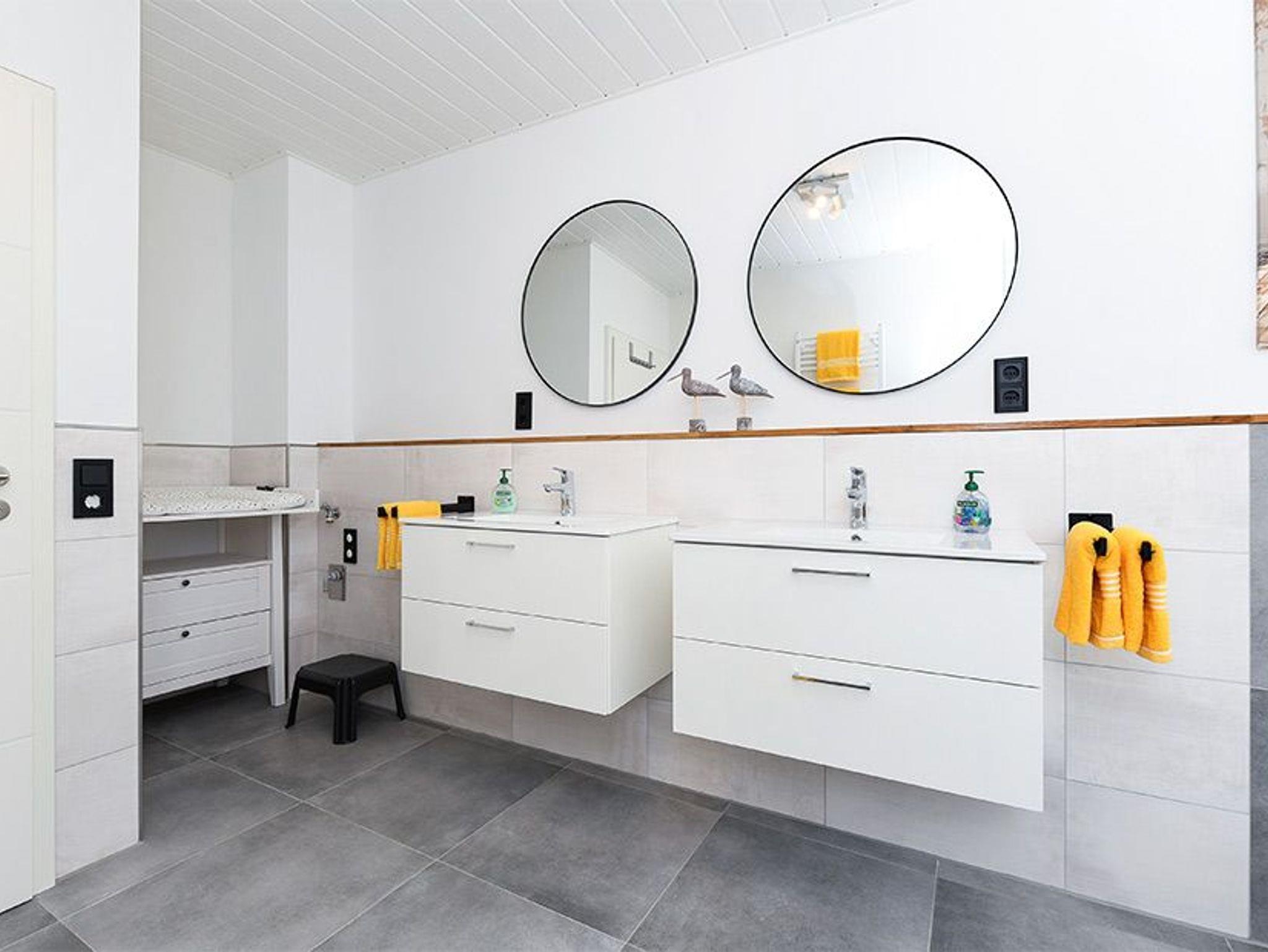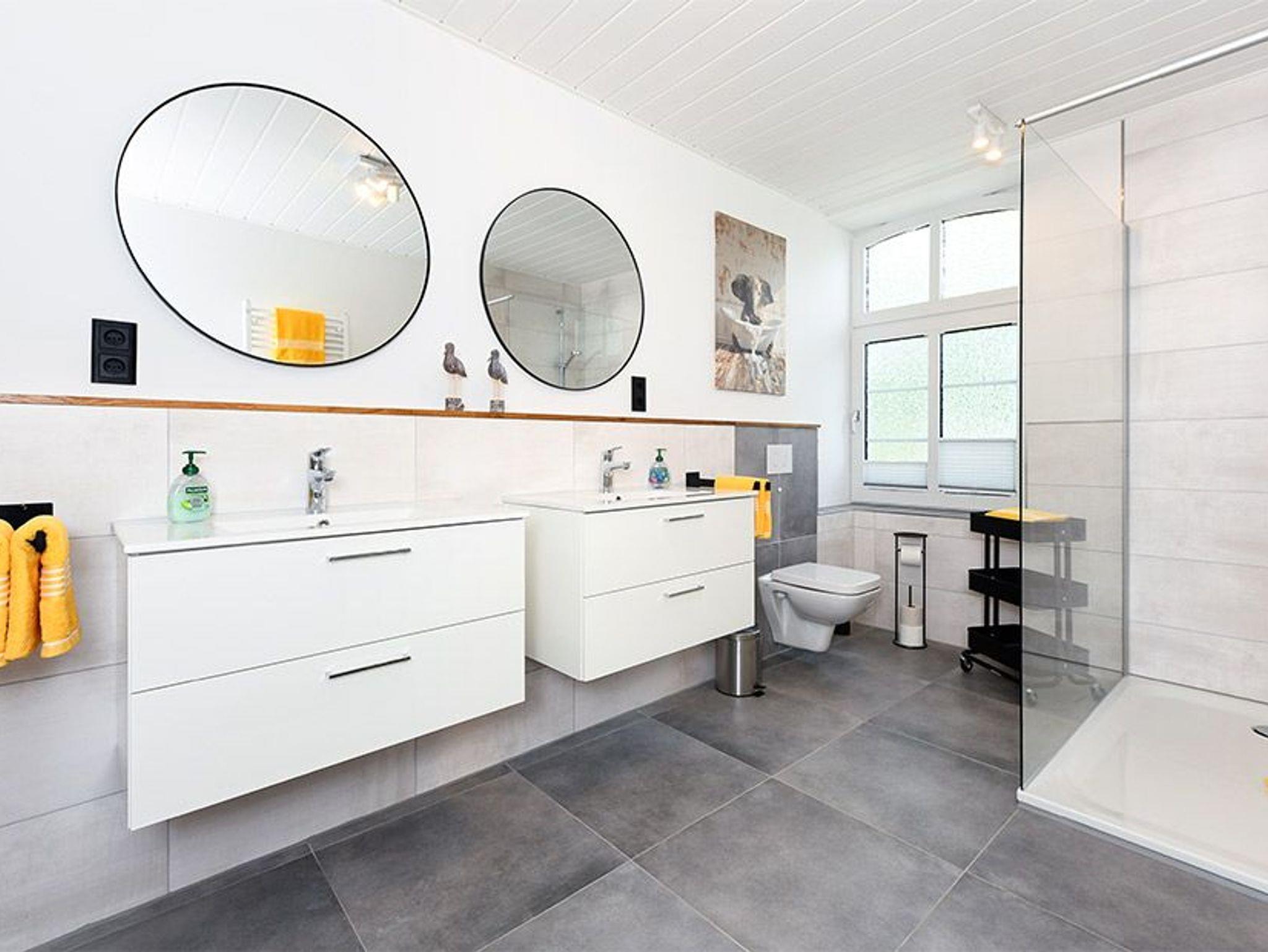 Badezimmer mit Doppel-Waschbecken, Dusche und WC