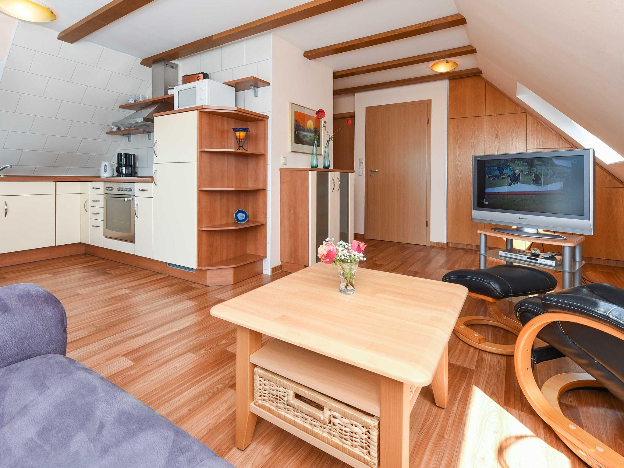 Größe ca. 50 Quadratmeter, Wohnraum mit integrierter Küche, Schlafzimmer, Badezimmer mit Dusche, Waschtisch und WC, Obergeschoss, Balkon, optimal für 1 bis 2 Personen