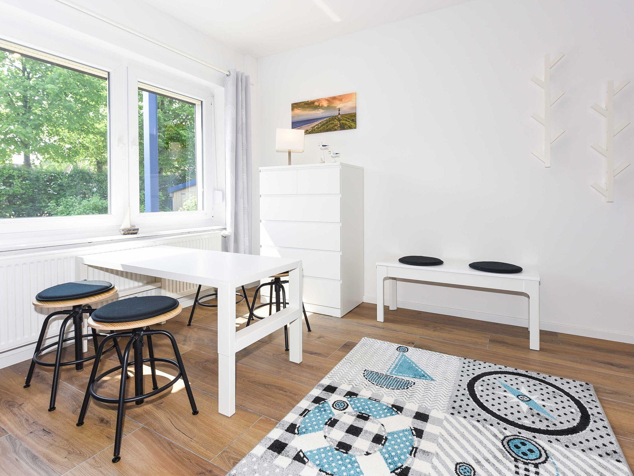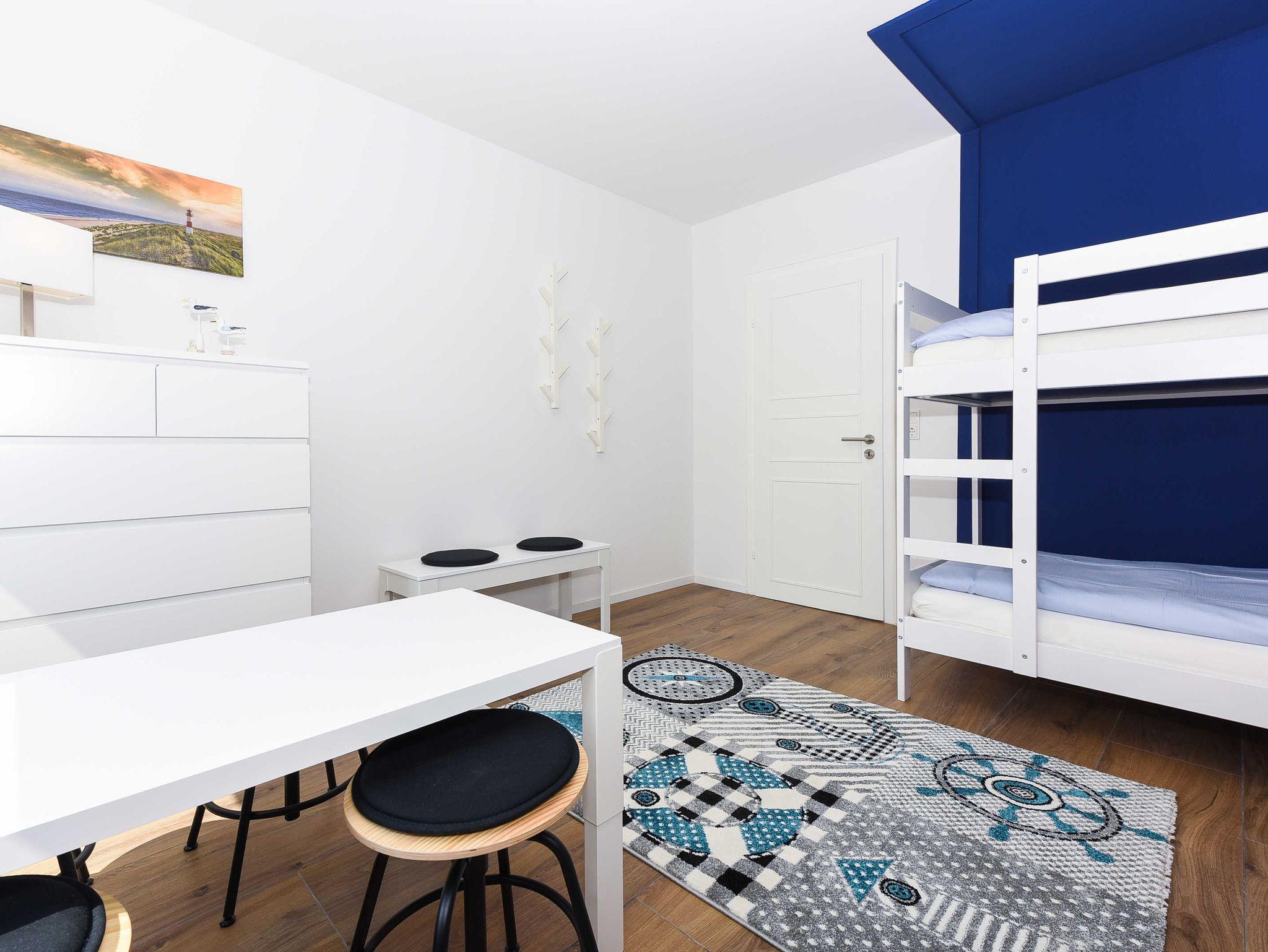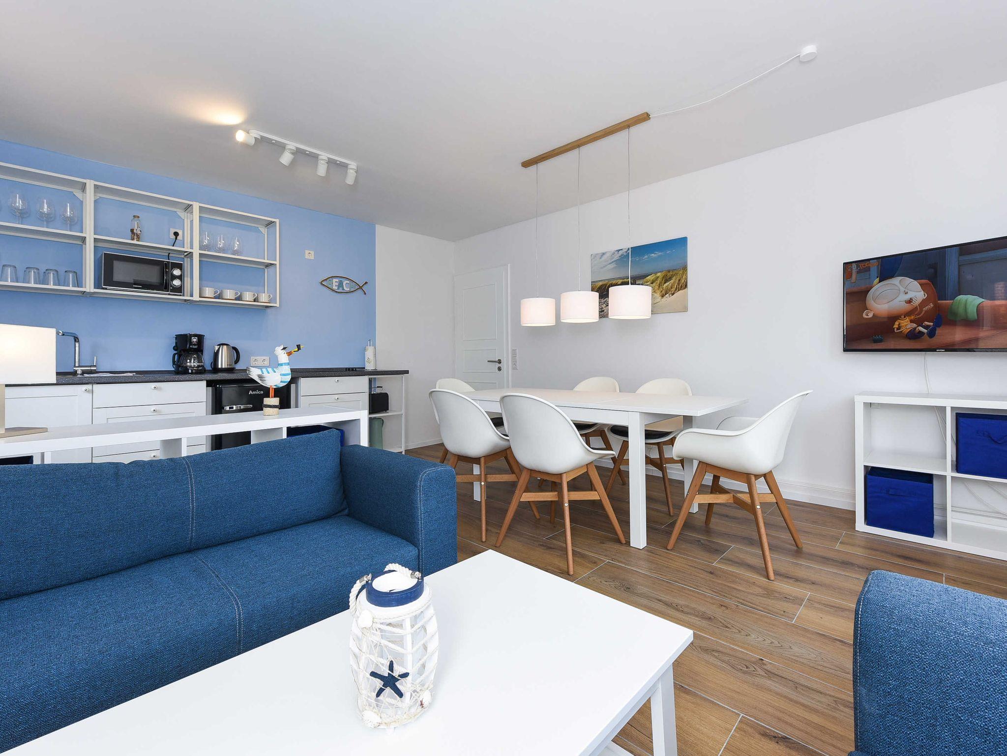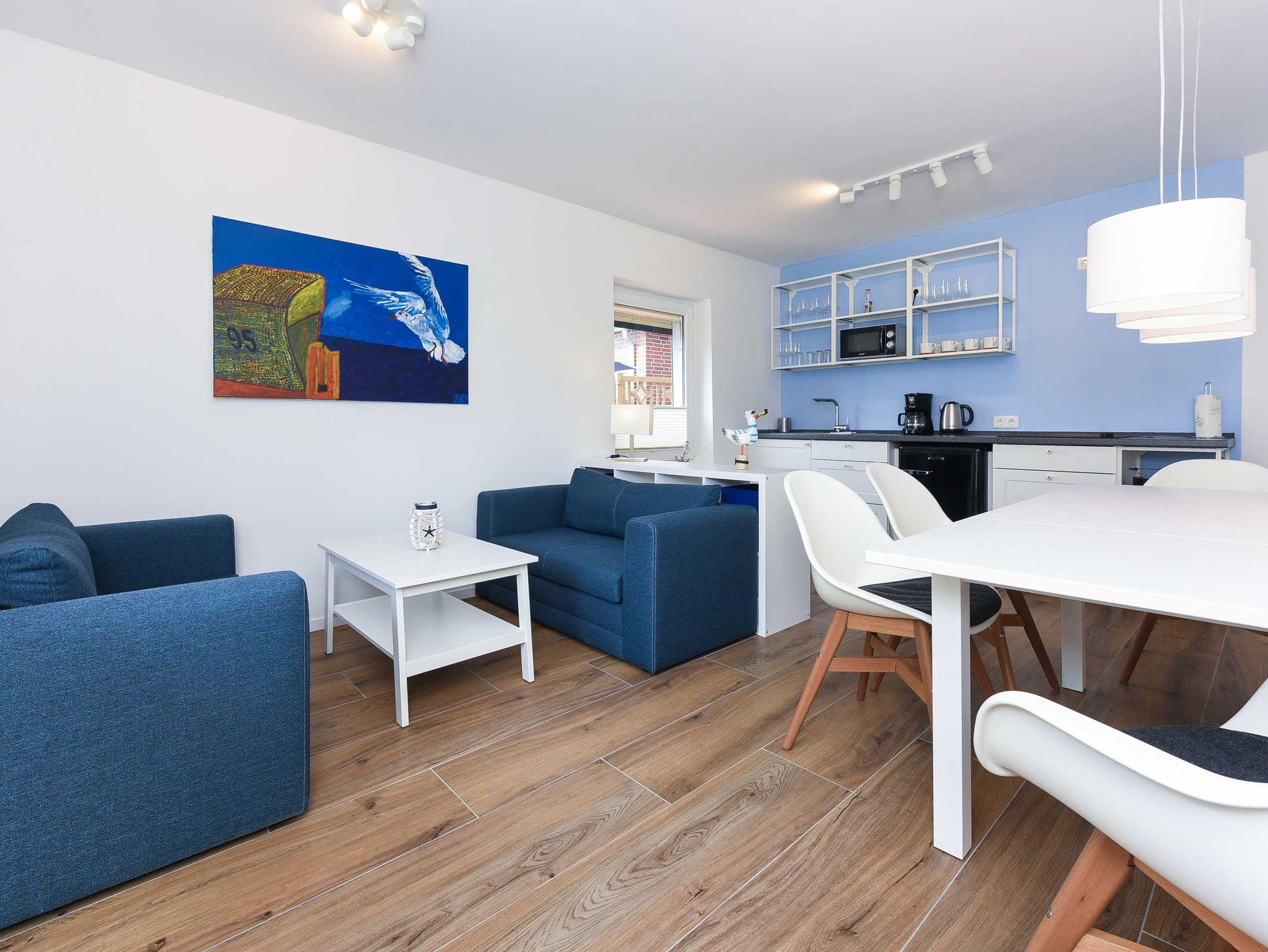 Modern und familienfreundlich: Ferienwohnung 5 im Blauen Haus in Bensersiel, nur 200 Meter vom Nordseedeich entfernt.