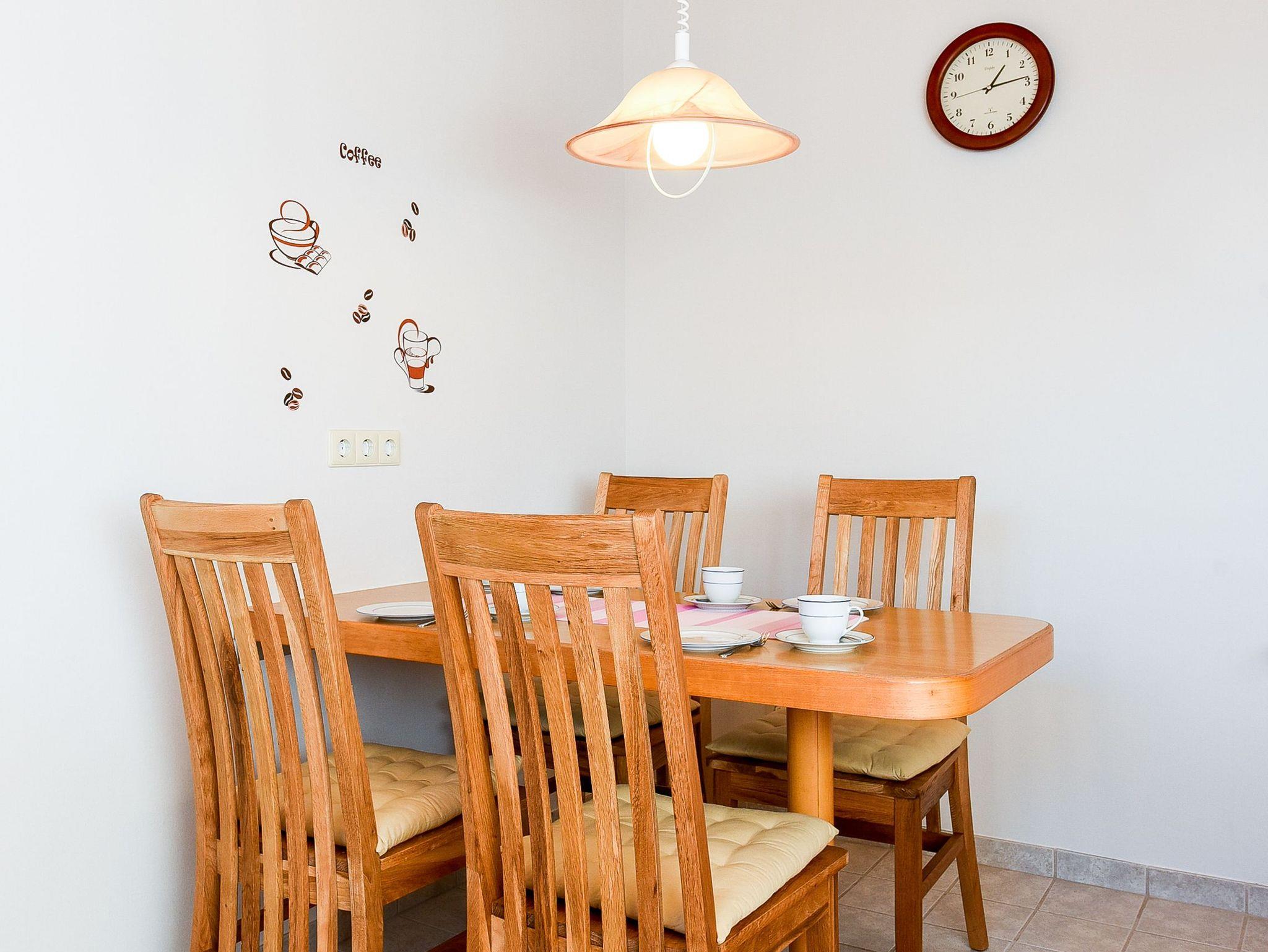 Größe ca. 120 Quadratmeter, Wohnzimmer. Küche mit Esstisch, Schlafzimmer, zweites separates Schlafzimmer/Kinderzimmer, Badezimmer mit Dusche, Waschtisch und WC, separates zweites WC, Erdgeschoss, Terrasse, optimal für 2 bis 4 Personen.