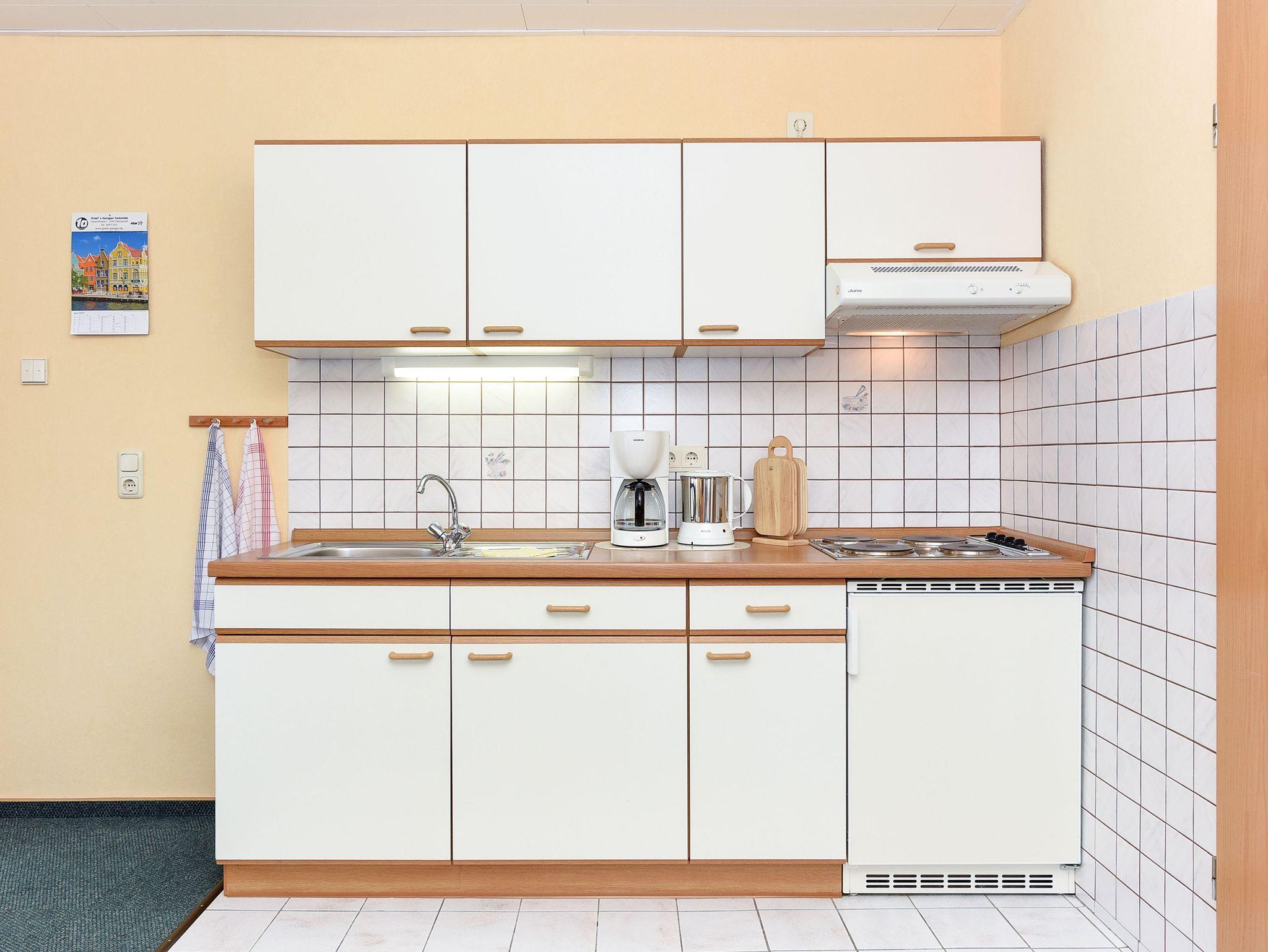 Größe ca. 40 Quadratmeter, Wohnraum mit integrierter Küche, Schlafzimmer, Badezimmer mit Dusche, Waschtisch und WC, Obergeschoss, Balkon, optimal für 1 bis 2 Personen.