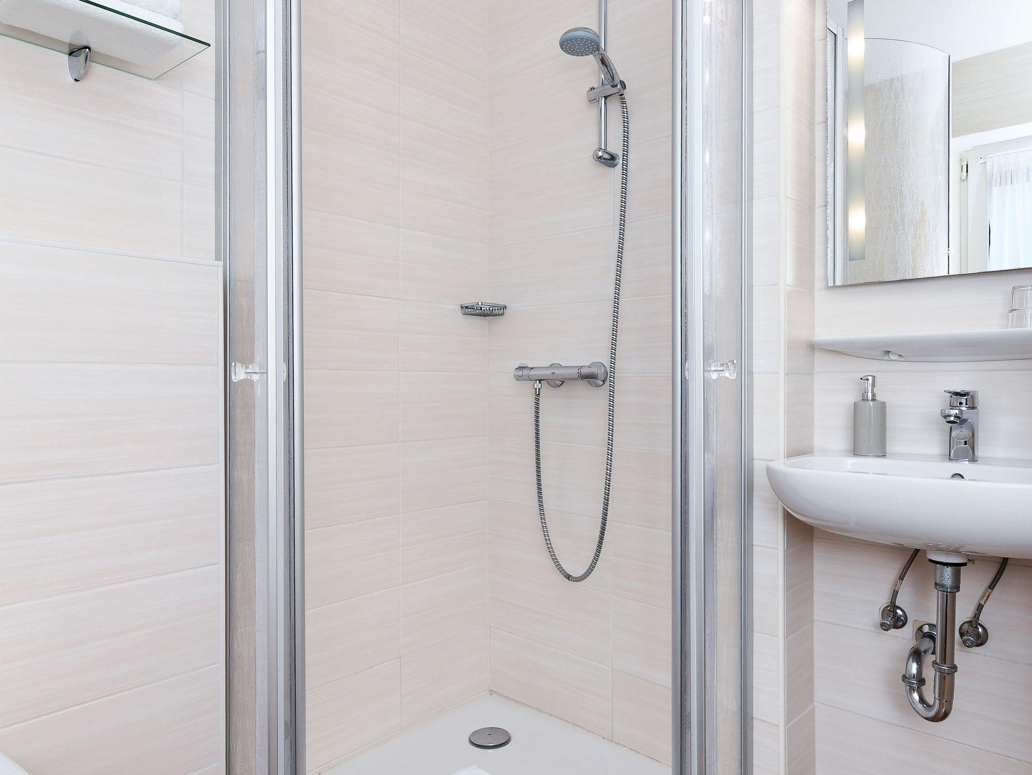 Größe ca. 20 Quadratmeter, Zimmer, Badezimmer mit Dusche, Waschtisch und WC, 1. Obergeschoss, optimal für 1 bis 2 Personen.